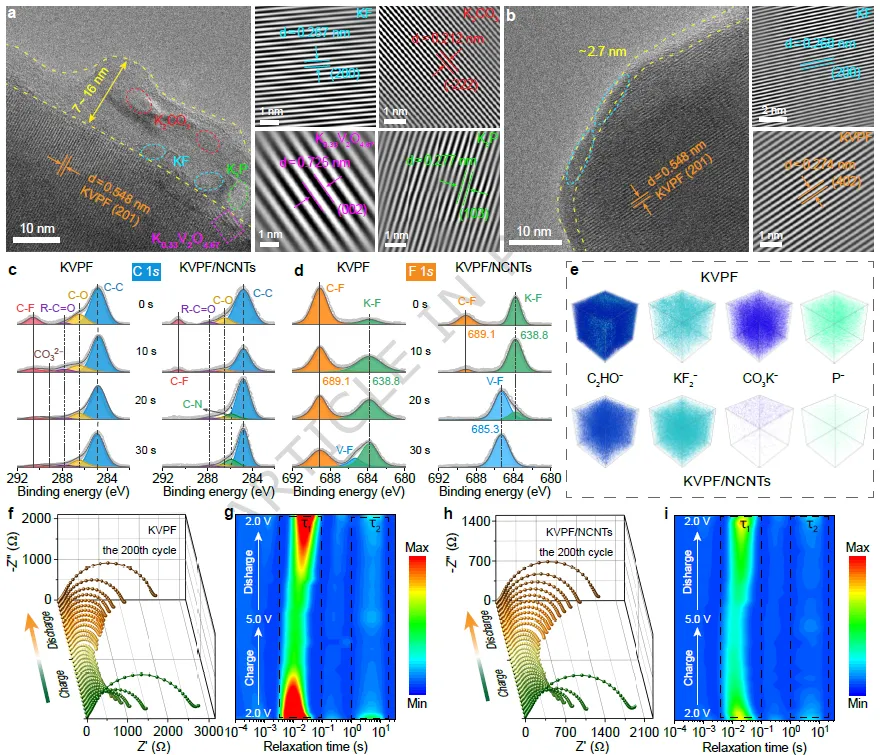 图5 | KVPF样品上CEI的成分分析。(所有测试电极均在0.5C倍率下循环200圈后收集)a,b,循环200圈后KVPF(a)和KVPF/NCNTs(b)电极的Cryo-TEM图像。c,d,不同刻蚀时间下循环后KVPF和KVPF/NCNTs电极的C 1s XPS深度剖面图(c)和F 1s XPS深度剖面图(d)。e,循环后KVPF和KVPF/NCNTs电极的ToF-SIMS表征。f,g,KVPF电极在第200圈循环过程中的原位EIS谱(不同电位下收集的原始实验数据)(f)及相关DRT分析(g)。h,i,KVPF/NCNTs电极在第200圈循环过程中的原位EIS谱(不同电位下收集的原始实验数据)(h)及对应的DRT分析(i)。