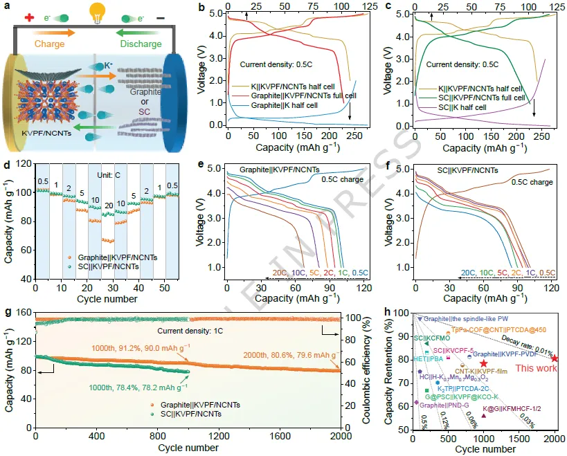 图6 | 不同全电池的储钾性能。a,Graphite||KVPF/NCNTs和SC||KVPF/NCNTs全电池工作机理示意图。b,c,Graphite||KVPF/NCNTs全电池(1C = 131 mA g⁻¹)(b)和SC||KVPF/NCNTs全电池(c)的典型去钾化/钾化曲线。d,全电池的倍率性能。e,f,Graphite||KVPF/NCNTs全电池(e)和SC||KVPF/NCNTs全电池(f)在不同电流密度下的相关充放电曲线。g,全电池的循环性能。h,Graphite||KVPF/NCNTs和SC||KVPF/NCNTs全电池与文献中先前报道的全电池的循环性能比较。