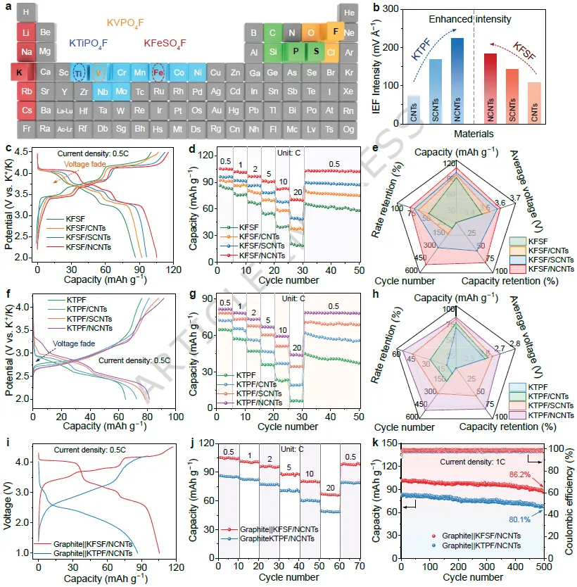 图7 | IEF在其他聚阴离子体系中的尝试与应用。a,扩展实验中研究对象选择的示意图。b,KFSF和KTPF样品的IEF强度。c–e,KFSF、KFSF/CNTs、KFSF/SCNTs和KFSF/NCNTs之间的恒流充放电曲线(1C = 131 mA g⁻¹)(c)、倍率性能(d)和综合性能(e)比较。f–h,KTPF、KTPF/CNTs、KTPF/SCNTs和KTPF/NCNTs之间的恒流充放电曲线(f)、倍率性能(g)和综合性能(h)比较。i–k,Graphite||KFSF/NCNTs和Graphite||KTPF/NCNTs全电池的代表性充放电曲线(i)、倍率性能(j)和循环性能(k)。
