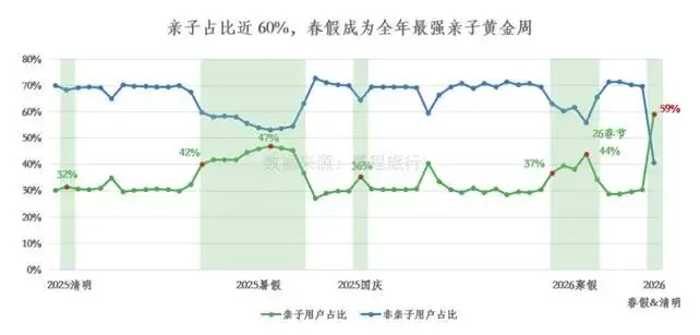 春假让家庭出游从黄金周扎堆转向从容出行,也为景区填平了传统淡季。携程数据显示,春假试点城市亲子用户出行占比从32%提升至59%,首次超越非亲子客群,成为绝对主力。出游偏好上,文化遗产类景区订单同比增长近3.5倍,乐园及自然遗产类景区春假客源占比达55%−65%。