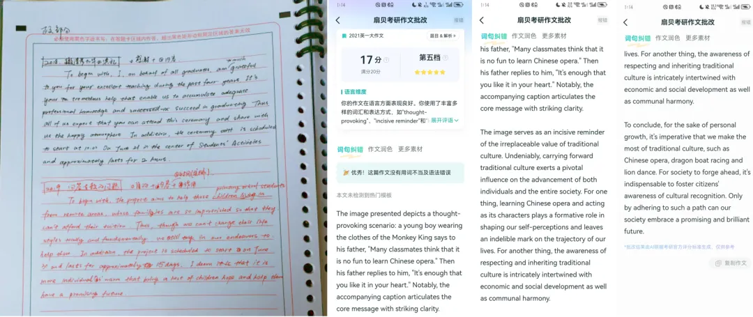 4.作文部分。这个可以往后放放,我是到了12月才开始背作文的。我把16-25年的大小作文真题打印下来,然后分析它们的类型,比如书信、通知分别考了几次,然后根据题型背万能模板和句式套进作文的壳子里面。大作文我到最后几天是直接总结了一套超万能的模板,到了考场直接换词默写。推荐大家写完用软件批改,我用的扇贝英语。