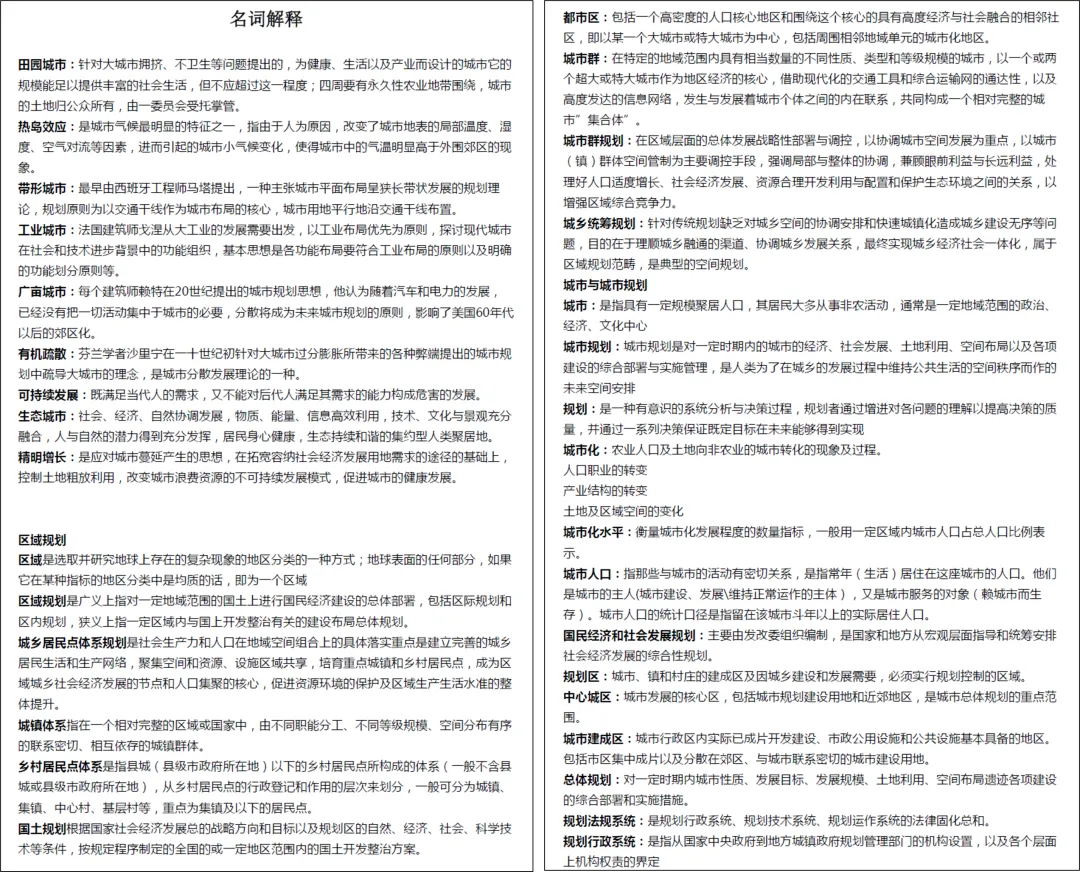 3.各部分题型。我把考试题型拆解下来跟大家谈谈。首先是填空题,填空题是客观题,填空题很考验同学们按照考纲搜集资料的能力,大家平时学习的时候尽量全面,综合各方资料去看,但是如果实在没有学到考试的题目也没办法。其次是名词解释和简答题,这两种题型一起去学去背,名词解释的答题量要小于简答题,但是你不知道他会把一个考点考名词解释还是简答题,所以尽可能多背,这样简答题才有话写。简答题分①②③一条一条去写,将重要的一句话放在前面,然后后面写一段去解释它。最后是大题部分,大题部分可以参照我写的提升部分,多去看城规类的热点,还有就是尽可能要写出规划的著名案例,大家平时多积累素材。
