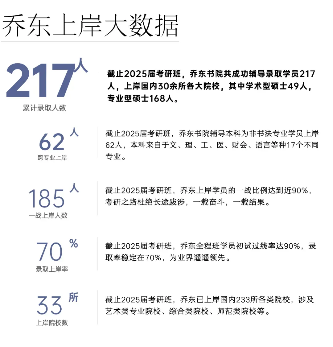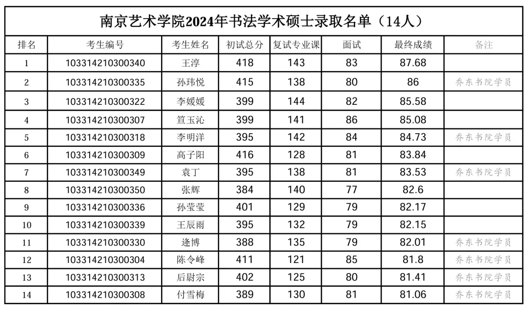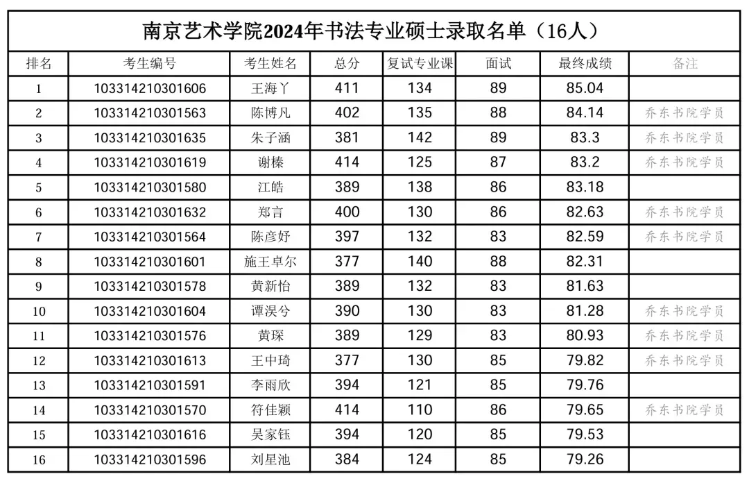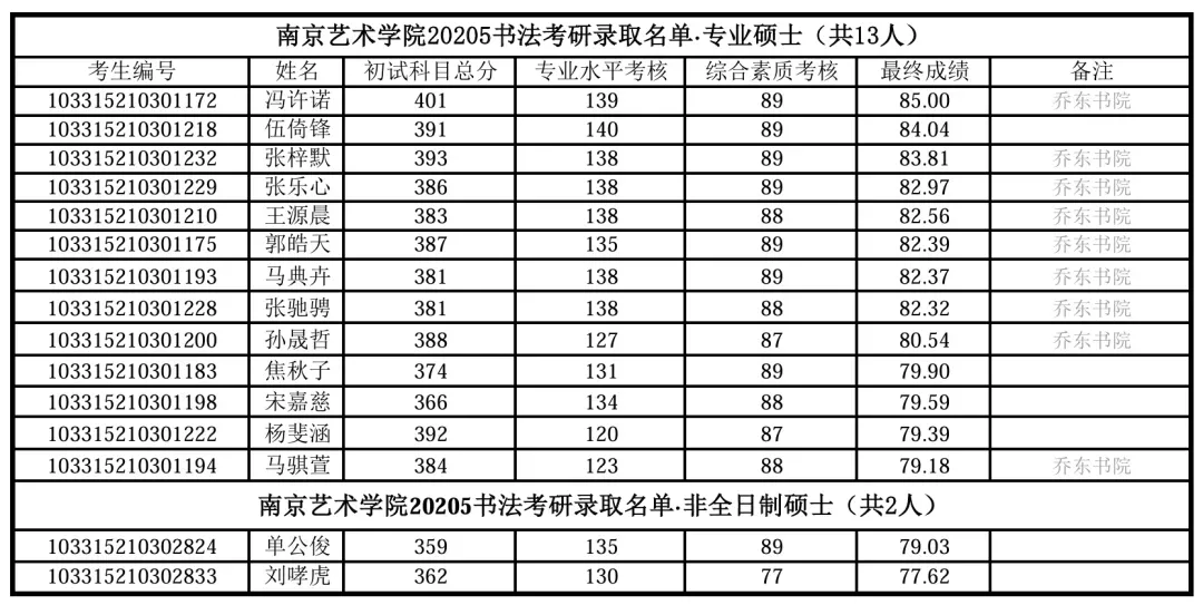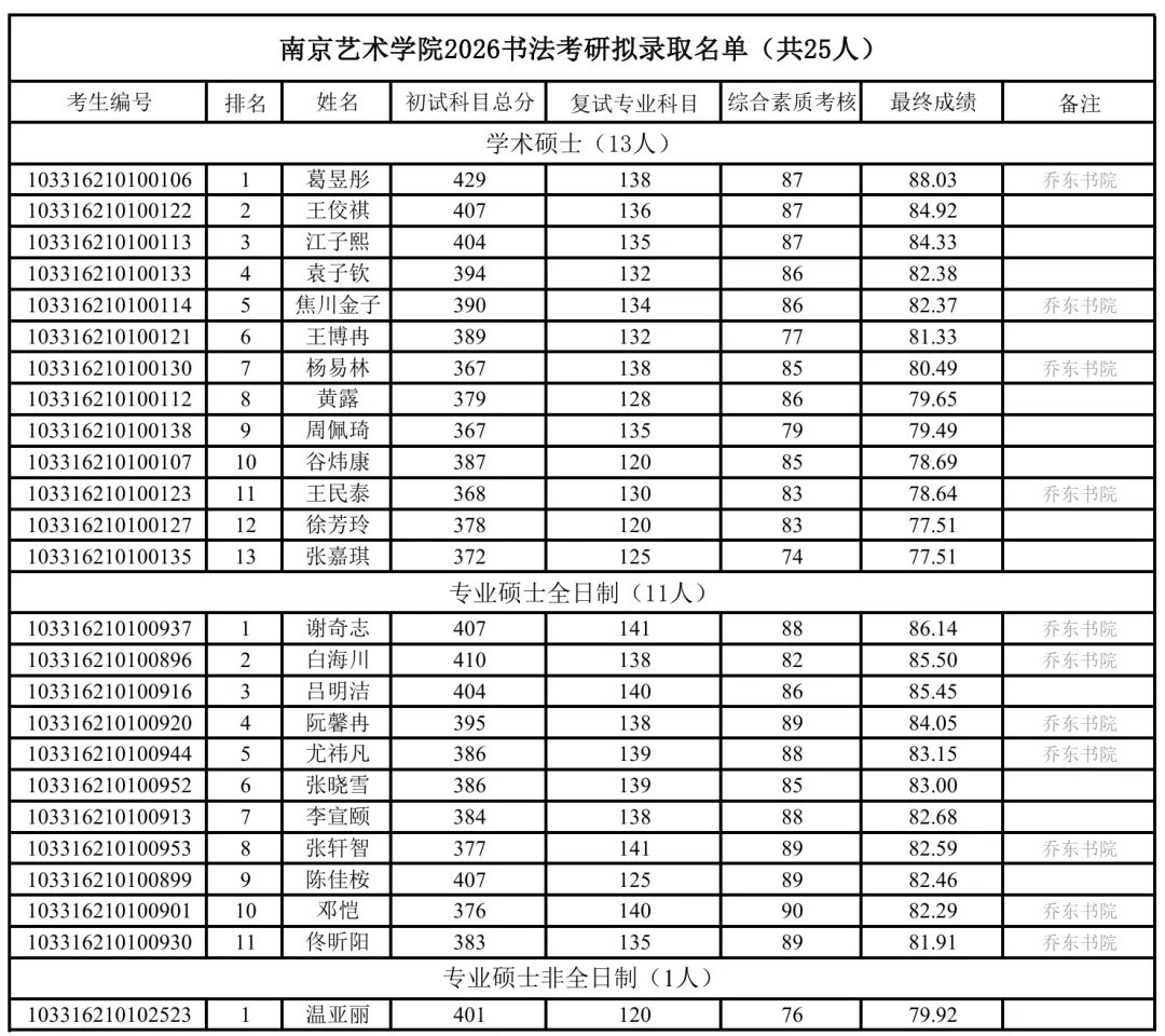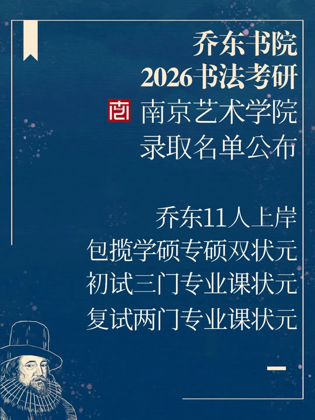 ·2026年南京艺术学院书法专业硕士共录取25人,其中学术型硕士13人,专业型硕士12人(全日制11人,非全日制1人),乔东书院书法考研班共11人录取,占录取总人数的近一半。并一举再次包揽学硕、专硕的第一名!恭喜上岸的各位乔东学子!
