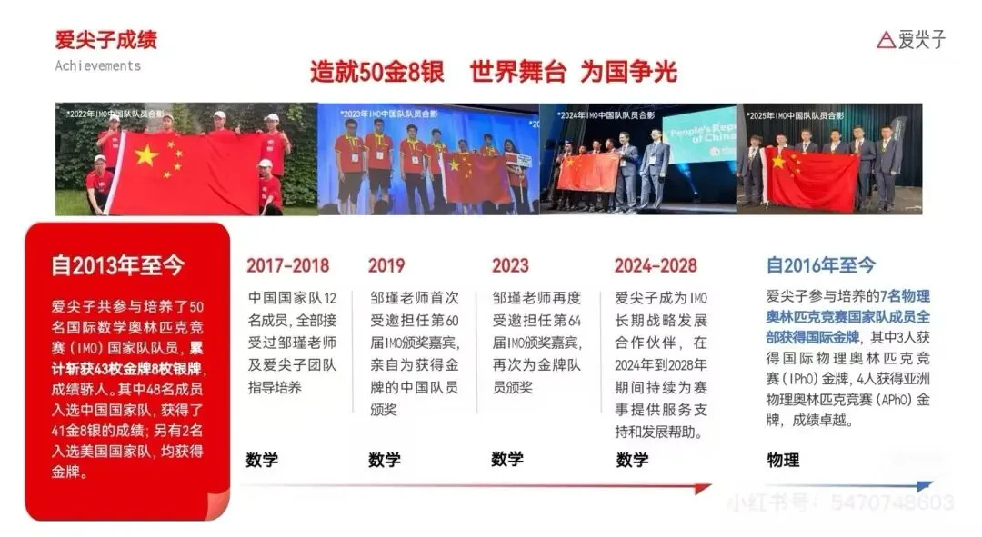 截至目前,爱尖子已参与培养57名国家队队员,斩获50块国际金牌(其中一名学员连续两届夺金)、8块银牌,帮助4600余名学员迈入清华北大。