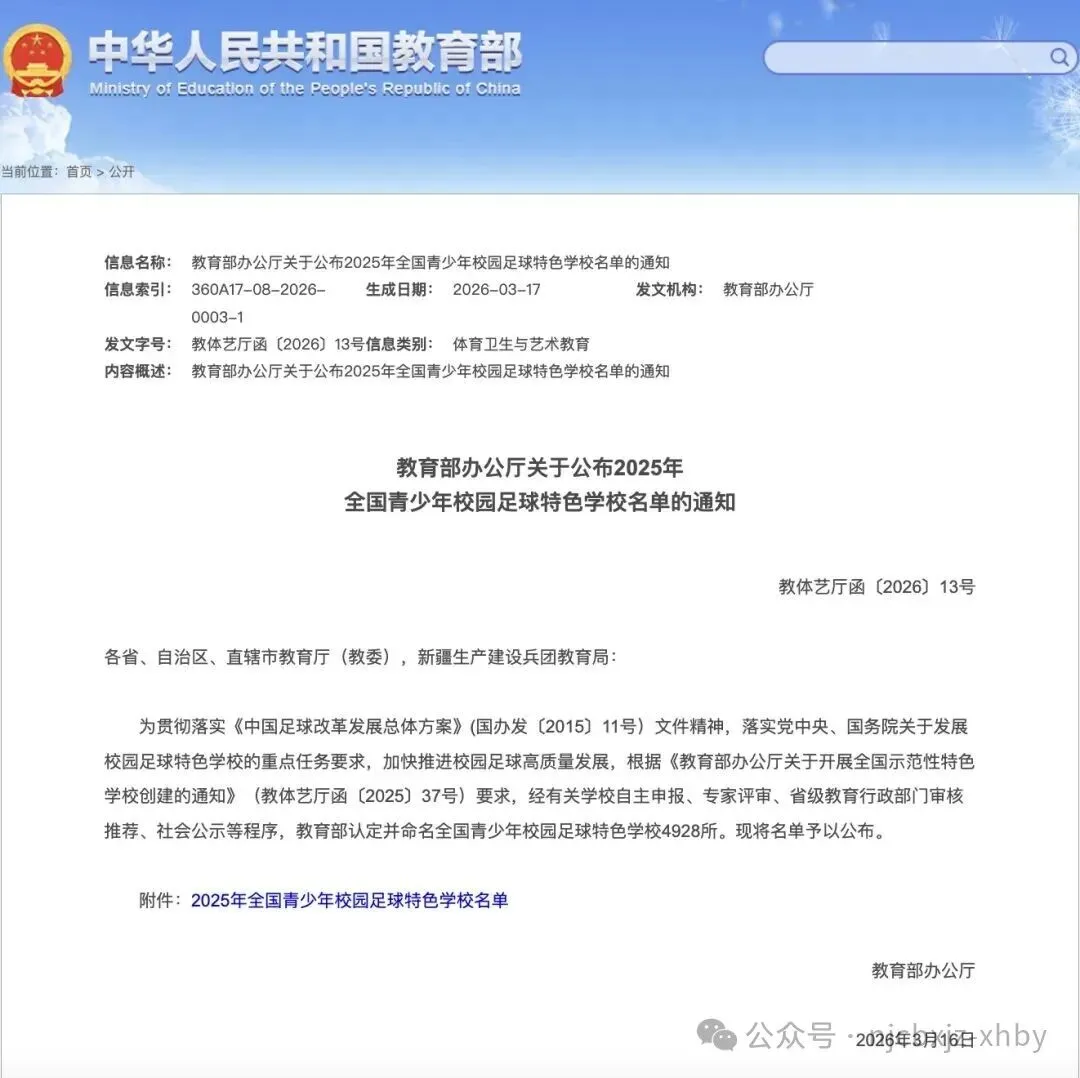 近日,教育部办公厅印发《关于公布2025年全国青少年校园足球特色学校名单的通知》(教体艺厅函〔2026〕13号)。教育部认定并命名全国青少年校园足球特色学校4928所。