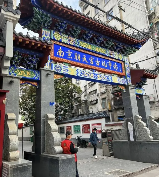 南京的老城区,随便一走都能撞见点历史的味道,这不,上回小长假,我和老友脚一软就往朝天宫古玩市场钻,天灰蒙蒙的,巷口拐进去就是一座牌坊,牌匾上蓝底金字,鲜亮地写着“南京朝天宫古玩市场”,人来人往,队伍热热闹闹,仿佛全城的老玩家都聚在这儿翻寻点什么。