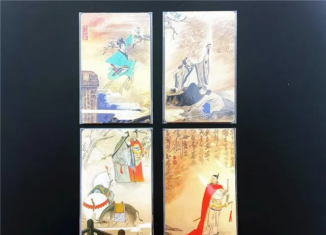这一组是画着旧戏文里的古人,水墨底子,衣袍鲜明,人物各个眉毛眼睛都带点戏台上的架势,有的是单刀赴会,有的是低头抚琴,透着点古意,看得出专门画过稿子的,细致不油腻,爷爷管这类卡叫“摆着能看懂戏的卡”,他说那时候电视上还经常放彩色戏曲,大人小娃都知道这些人物咋个来头,现在的小孩盯着动画片,对吴用、林冲、玉堂春这些名字都生,老物件里的故事也就这么断了线。