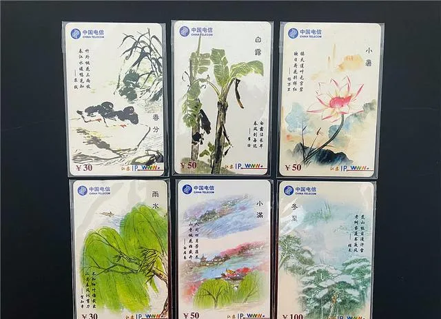 电话卡里还能翻出一组二十四节气卡,泼墨画风,春分、白露、小暑轮了一圈,画面都是小桥流水青山,字写得不紧不慢,家里有老一辈识字的都爱把这卡翻着看,嘴里念叨一两句节气诗,前几年单位还用过作办公室装饰,挂墙上不压什么大事,却有点气场。