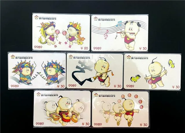 这个卡面上画着两只小胖娃娃,穿着肚兜,笑得很精神,手里舞着彩带,牌子下方写着“第六届中国艺术节”,我看了半天,觉得比起现在高冷的IP形象,这俩小人物才是地气,连眉毛都带着点淘气劲,记得那阵村广播里天天吆喝新中国艺术节,满条街的旗子让人看得晕头转向,那会孩子看见大回事总能围一堆热闹。