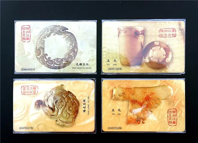 这组是徐州汉墓出土的文物卡,整个卡片底色往旧纸色贴,前面摆着玉璧、玉瓶,还有造型拧巴的玉器雕花,摊主拍着胸口说:“这是真正沉过历史的卡!”我笑笑没搭腔,这年代谁懂多少文物啊,能记住一个是一个,之前上学时脑袋里只有个“土里刨金”四个字,真东西往手里一捏才知分量。