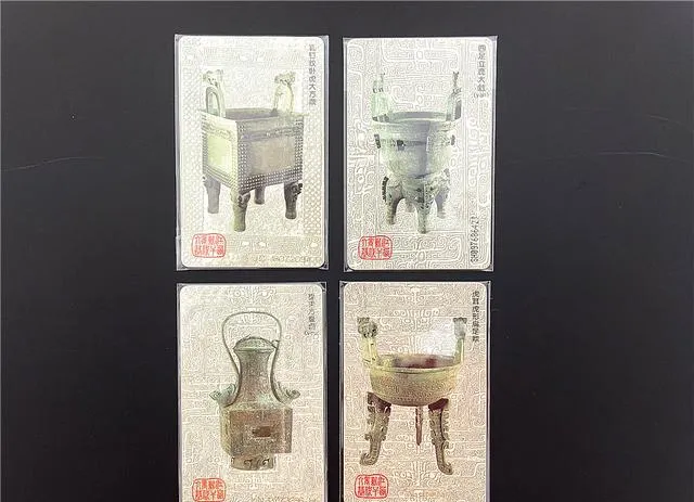 图中这几张青铜器卡,一个个全是方鼎、圆鼎、壶罐,大块头沉甸甸敞着口,纹路绕卡边,背后故事也不管你认不认得,只要一亮出来就是气派,爷爷说老祖宗的东西,就得看“分量”和“气势”,别的啥都比不上。