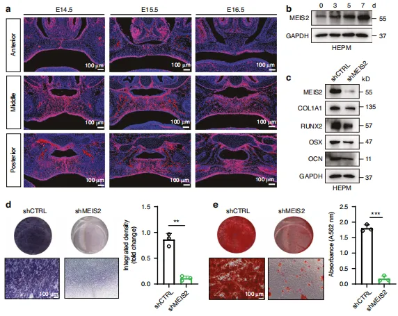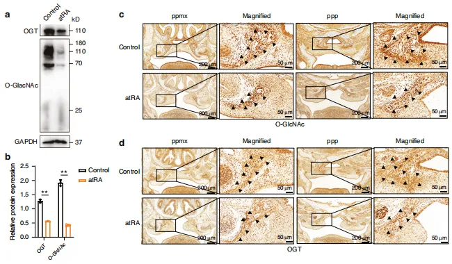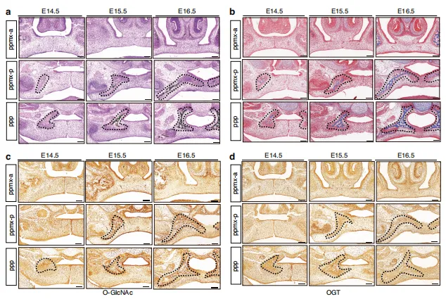 研究导读:本文由南京医科大学附属口腔医院正畸科于《International Journal of Oral Science》(IF:12.2)发表,本研究共同揭示了MEIS2 O-GlcNAc修饰在腭骨发育中的重要作用,并为理解腭部发育调控网络建立了新的理论框架。该发现可能为未来腭裂的诊断与预防提供新途径。图1:OGT 和O-GlcNAc修饰在腭部发育中起关键作用。(a)VonKossa染色与(b)Masson三色染色显示E14.5至E16.5冠状切面结果,黑色虚线标示腭骨区域。(c、d)E14.5至E16.5冠状切面 OGT 及整体O-GlcNAc修饰的代表性免疫组化染色结果。比例尺:100 μm图2:atRA诱导小鼠中O-糖基化修饰的下调及其在腭部发育调控中的作用。a 对照组小鼠与atRA小鼠腭部托架组织中 OGT 及O-糖基化表达的蛋白质印迹分析。b (a)中相对蛋白水平的半定量数据。c E15.5胚胎冠状切片中整体O-糖基化修饰的代表性免疫组化染色结果。d E15.5胚胎冠状切片中 OGT 的代表性免疫组化染色结果。n=3次生物学独立实验。ppmx上颌骨腭突,ppp腭突腭突图3:斑马鱼中O-GlcNAc糖基化缺失导致的腭裂与蝶骨旁骨形成障碍。a Tg(sox10:eGFP)转基因斑马鱼幼体腹侧荧光代表性视图。腭部骨骼经解剖后平铺固定,前部朝上。白色实线表示筛骨腭。比例尺:100 μm 。b 9日龄斑马鱼幼体骨结构腹侧(上方)视图示意图。aa:关节角;br1:鳃弓肋1;en:翼外肌;m:上颌骨;n:脊索;o:鳃盖;p:蝶骨旁;br2:鳃弓肋2;c:镫骨;cb:角鳃骨5;ch:角软骨;d:下颌骨;hm:下颌骨下部;v:椎骨;bop:基枕关节突图4:OGT 敲低对 HEPM 细胞体外成骨分化过程的负面影响。a 成骨分化过程中 OGT 蛋白水平的蛋白质印迹分析。b shCtrl与shOGT HEPM 细胞的代表性Edu染色图像。shCtrl短发夹对照(对照慢病毒),shOGT短发夹 OGT(OGT 慢病毒)。c 经指定处理的 HEPM 细胞中成骨标志物(COL1A1、RUNX2、 OSX 和氰酸盐)的表达及蛋白质水平,通过蛋白质印迹法评估。d 经指定处理的 HEPM 细胞中成骨基因(COL1A1、RUNX2、 OSX 和氰酸盐)的表达及mRNA水平,通过实时定量PCR评估。e、f 经指定处理的 HEPM 细胞中碱性磷酸酶(ALP)和抗逆转录酶(ARS)染色结果。图5:MEIS2对腭骨形成至关重要。a 对E14.5至E16.5冠状切片中MEIS2的免疫荧光染色。b 骨形成分化过程中MEIS2蛋白水平的蛋白质印迹分析。c 骨形成标志物(COL1A1、RUNX2、 OSX 和氰酸盐)的表达及按指定处理的 HEPM 细胞蛋白水平,通过蛋白质印迹法评估。d、e 按指定处理的 HEPM 细胞的碱性磷酸酶(ALP)和抗原识别序列(ARS)染色。n = 3次生物学独立实验。图6:OGT 介导的MEIS2 Ser237位点O-GlcNAc修饰。a 共免疫沉淀实验证实了 HEPM 细胞中 OGT 与MEIS2的相互作用。b 采用代表性免疫荧光染色法检测 HEPM 细胞内亚细胞 OGT(绿色)与MEIS2(红色)的定位。比例尺:5 μm 。c、d 通过sWGA下拉实验观察HEK293细胞中外源性MEIS2及 HEPM 细胞内源性MEIS2表达。细胞收获前经30 μΜ TMG 或 OSMI -1处理12小时。e MEIS2跨物种蛋白质序列比对。f HEK293细胞中sWGA下拉实验结果。转染HA-MEIS2(野生型或S237A突变体)质粒的细胞。g 对HA-WT或HA-S237A突变体转染HEK293细胞中 WCL 及免疫沉淀物进行免疫印迹分析。