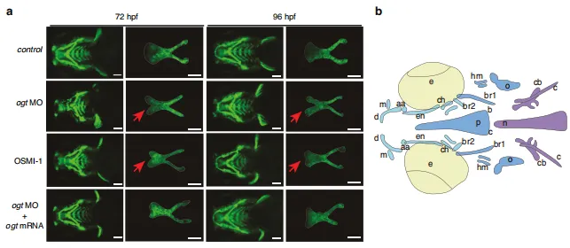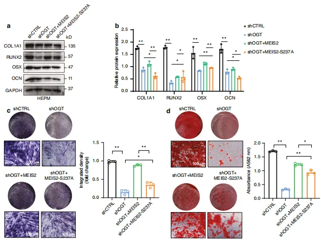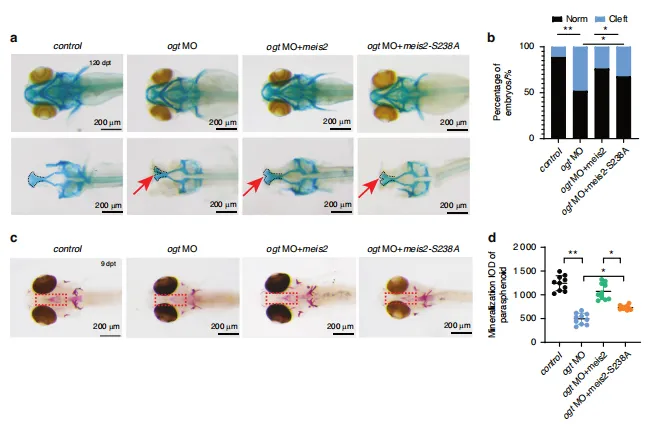图8:MEIS2 O-GlcNAc化对SHOX2表达的调控。 HEPM 细胞经 OGT shRNA慢病毒载体转染以诱导内源性 OGT 敲低,随后感染表达MEIS2(野生型或S237A突变体)的质粒。a 上述处理条件下 HEPM 细胞中MEIS2的代表性免疫荧光染色结果。b 采用抗MEIS2抗体对核质组分进行免疫共沉淀(IB),并定量分析MEIS2在核质中的比例分布。n=3次生物学独立实验。c 上述处理条件下 HEPM 细胞中SHOX2与MEIS2蛋白水平的蛋白质印迹(WB)分析。d 双荧光素酶报告基因实验显示MEIS2过表达对 HEPM 细胞中SHOX2启动子相对活性的影响。n=3次生物学独立实验。e 通过双荧光素酶报告基因实验测定SHOX2启动子荧光素酶报告构建体的活性。n=3次生物学独立实验。图9:MEIS2的O-GlcNAc修饰在体外促进腭部成骨发育。 HEPM 细胞通过转染 OGT shRNA慢病毒载体诱导内源性 OGT 基因敲低,随后感染表达MEIS2(野生型或S237A突变体)的质粒。a、b 采用蛋白质印迹法及半定量分析检测 HEPM 细胞中成骨分化标志蛋白的表达水平(处理方法同上)。c、d 对指定处理的 HEPM 细胞进行碱性磷酸酶(ALP)和抗原识别序列(ARS)染色。图10:MEIS2的O-糖基化修饰在体内促进腭部成骨发育。a 120小时受精后斑马鱼幼体经阿尔新蓝染色图像。黑色虚线表示筛骨腭部。b 对斑马鱼胚胎腭裂发生率进行定量分析。n=3次生物学独立实验。c 9日龄斑马鱼幼体ARS染色图像。d 对(c)图中蝶骨旁骨矿化 IOD 进行半定量分析。n=10。总之,本研究证实 OGT 介导的OGlcNAc化通过抑制MEIS2泛素化来稳定其结构,从而调控腭部发育过程中的成骨分化。Ser237被鉴定为MEIS2的关键O-GlcNAc化位点。这些发现为腭裂的分子诊断提供了新见解,并提出 OGT -MEIS2轴可作为潜在治疗靶点。