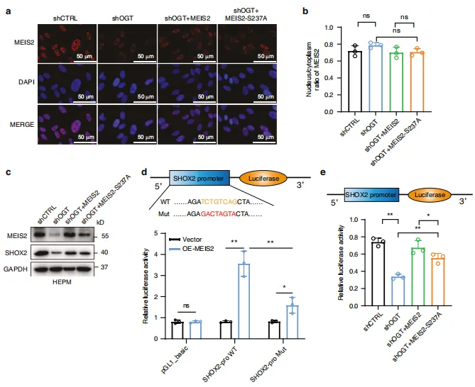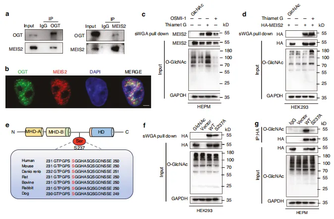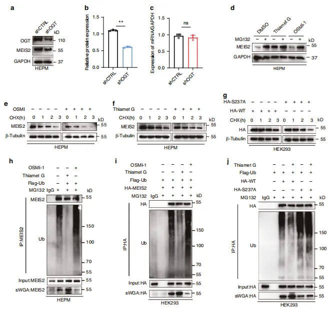 图7:通过抑制泛素化作用实现MEIS2的O-GlcNAc修饰稳定化。a、b shCtrl和shOGT HEPM 细胞中MEIS2蛋白水平的Western印迹(WB)及半定量分析。shOGT是short hairpin OGT(OGT 慢病毒)的缩写。c shCtrl和shOGT HEPM 细胞中MEIS2 mRNA水平的qRT-PCR结果。d HEPM 细胞在经DMSO、30 μmol/L Thiamet G或30 μmol/L OSMI -1处理12小时后,接受10 μmol/L MG132处理8小时。通过WB观察MEIS2表达。e、f HEPM 细胞中MEIS2的半衰期分析。经250 μmol/L CHX 处理指定时间后,通过免疫印迹(IB)观察细胞中MEIS2水平。细胞分别接受DMSO、30 μmol/L OSMI -1或30 μmol/L Thiamet G处理。g HEK293细胞中HA-MEIS2的半衰期分析。经250 μmol/L CHX 处理指定时间后,通过IB观察HEK293细胞中HA-MEIS2水平。转染HA-MEIS2(野生型或S237A)质粒的细胞。h、i 细胞接受DMSO、30 μmol/L Thiamet G或30 μmol/L OSMI -1处理12小时后,通过抗MEIS2或抗HA抗体免疫沉淀观察内源性(h)或外源性(i)MEIS2泛素化。j 细胞转染HA-WT或HA-S237A质粒并经30 μmol/L Thiamet G处理12小时后收集,通过免疫沉淀法检测MEIS2泛素化水平。