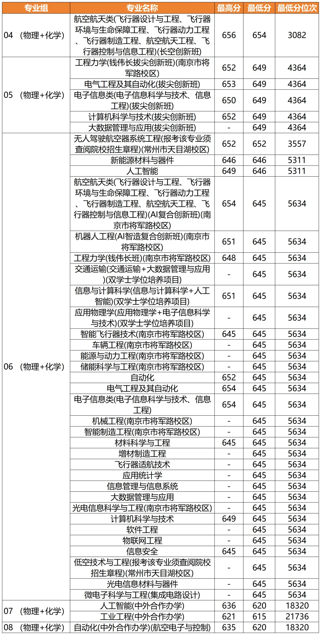南京航空航天大学2025年专业录取分数(物理类)