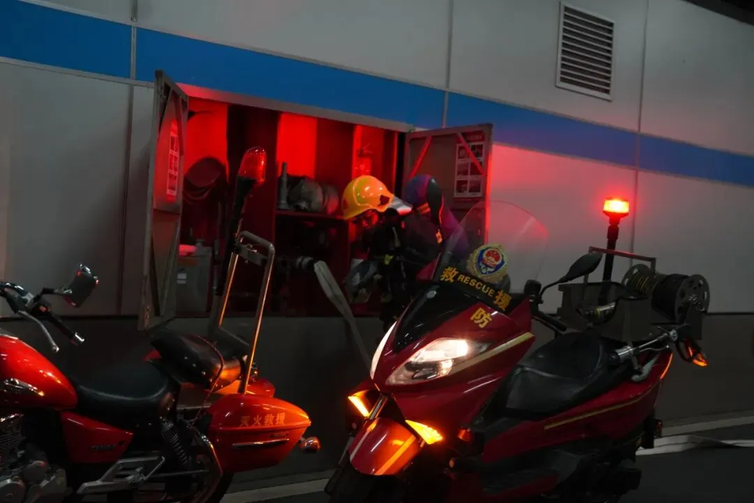 隧道内车流拥堵,扬子隧道专职消防队消防摩托化身“快速尖兵”,灵活穿梭抵达核心区域,随车背负式新能源灭火系统精准控火。