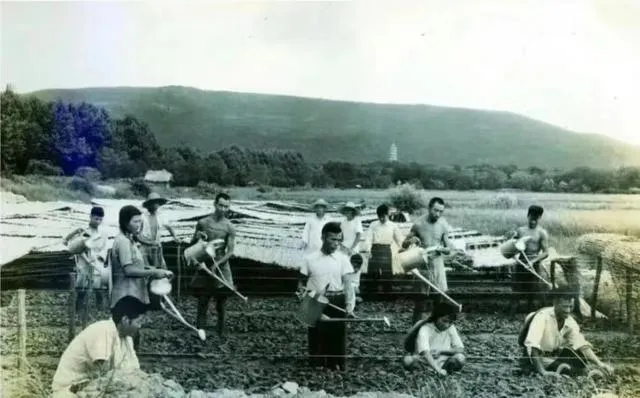 图中这一懵懂的老照片,大家伙都站在田里,工具一水排开,后头是钟山和塔,格局一下子就开阔起来了,有人光着膀子,有人低头弯腰,农家忙活的劲头一阵风就能刮到镜头外头,哪个年代的人看到都得感慨一声,衣服素净,家什朴实,真是靠双手拱出来的日子,