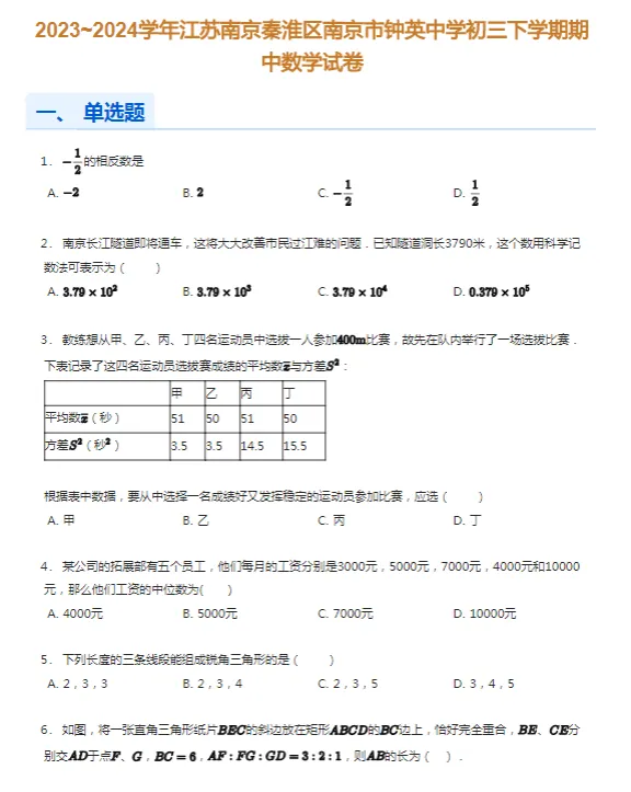 33套2016-2024学年南京各区初三下学期期中数学真题及答案解析