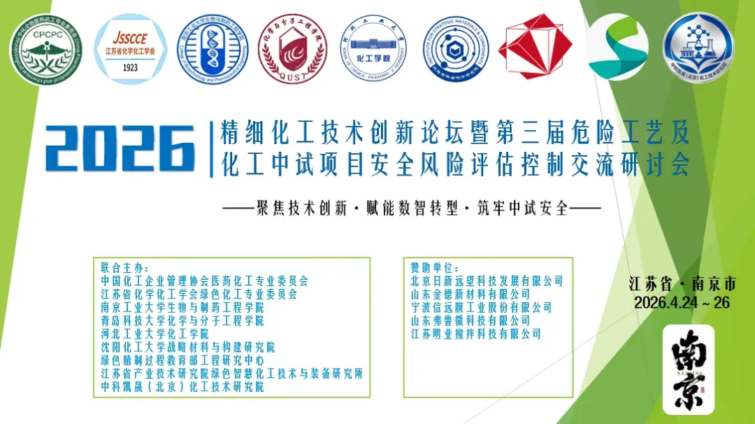 为搭建高端行业交流平台,汇聚行业专家、企业代表与科研机构力量,聚焦技术创新核心、分享智能化转型经验、破解中试风险评估难题,助力精细化工行业高质量转型,我单位定于2026年4月24日—26日在南京市举办“2026精细化工技术创新论坛暨第三届危险工艺及化工中试项目安全风险评估控制交流研讨会”,邀请行业专家学者及企业负责人与会,共探行业发展热点与难点。请有关单位派员参加,现将相关事宜通知如下: