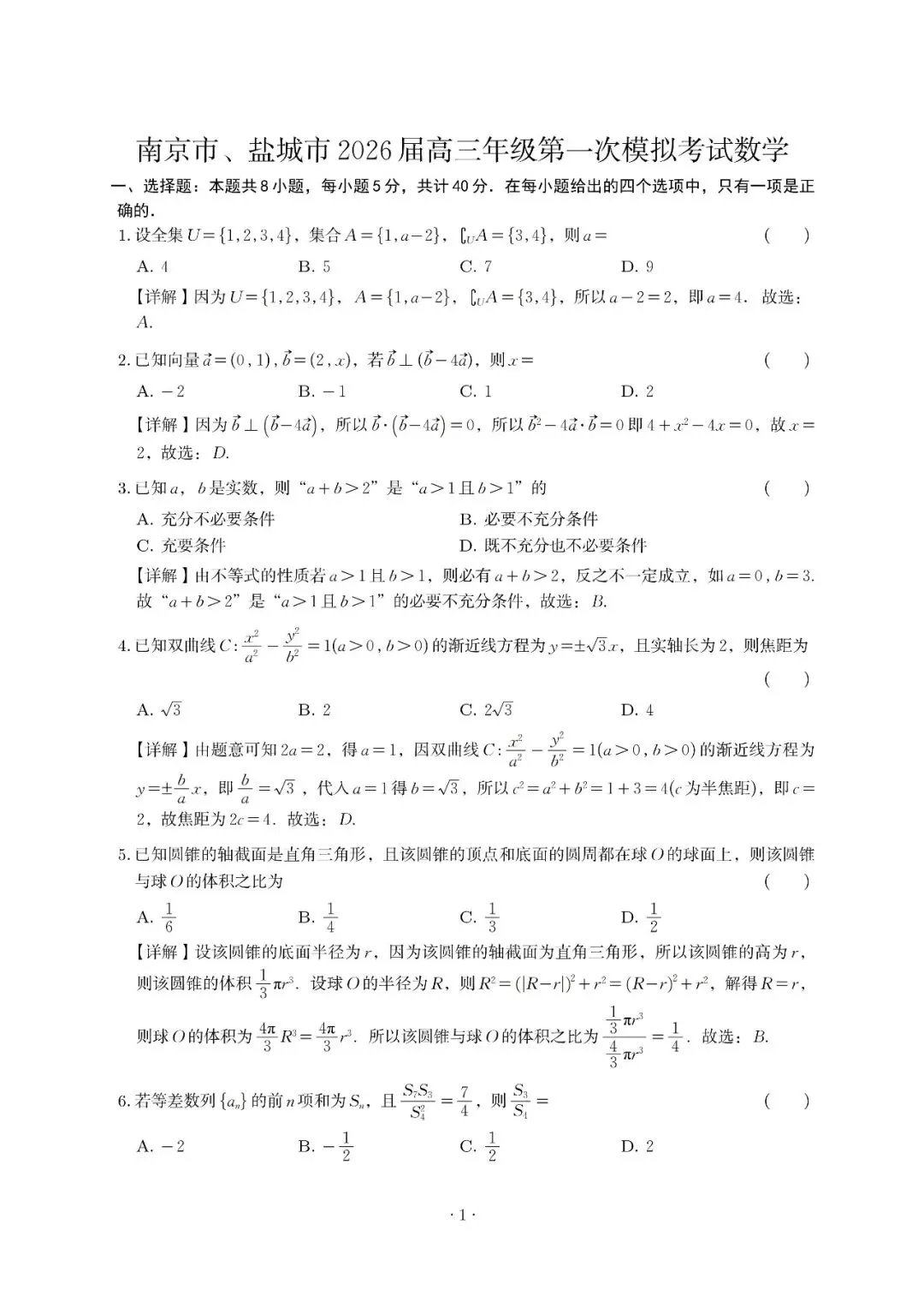 南京市、盐城市2026届高三年级第一次模拟考试数学