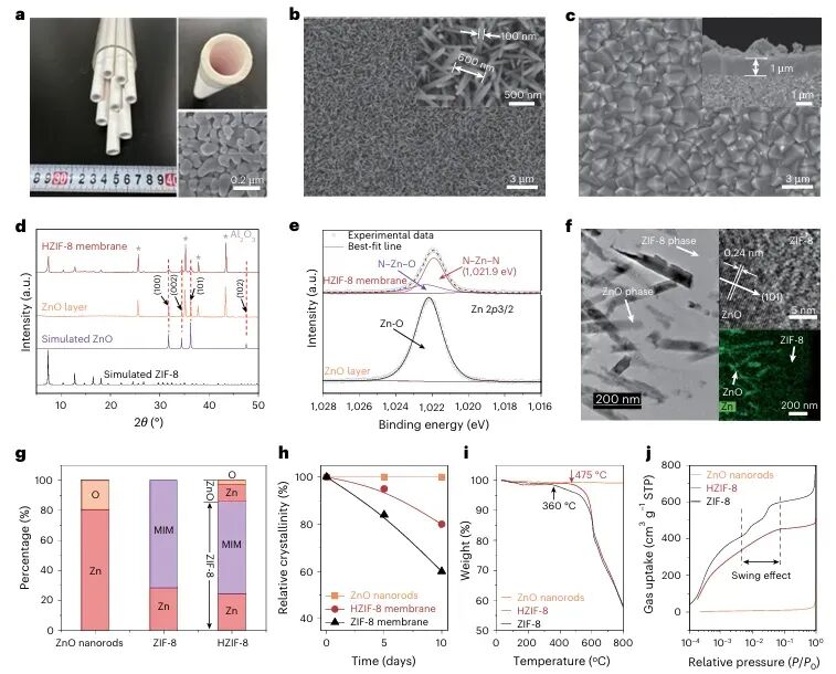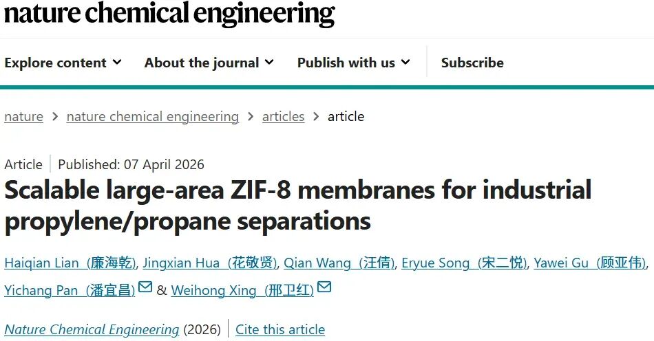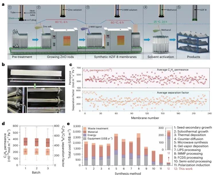 丙烯(C₃H₆)与丙烷(C₃H₈)的分离因分子性质仅差一个双键,传统蒸馏能耗极高,是“改变世界的七大化学分离”之一。膜分离虽具节能潜力,但聚合物膜受限于渗透性-选择性博弈及烯烃诱导的溶胀问题,尚无商业化产品。ZIF-8因其精确孔结构与稳定性成为理想膜材料,然而从实验室(<10 cm²)向工业级(≥50 cm²)可扩展、无缺陷制备仍是核心瓶颈,制约其商业应用。鉴于此,来自南京工业大学的邢卫红研究员和潘宜昌研究员提出了一种微空间转化过程(MSTP),用于构建ZIF-8膜,实现了可扩展制备与微观结构演化控制。该策略利用管状支撑体的密封内腔作为限域反应空间,将锌源以垂直排列的ZnO纳米棒阵列形式预锚定在内表面,合成液中仅含2-甲基咪唑(2-MIM)配体。配体引入后,ZnO纳米棒逐渐溶解,产生局部Zn²⁺富集环境,优先与配体配位,有效抑制了溶液中的均相成核。同时,微空间缩短了传质路径,实现了时空上更均匀的浓度场,从而原位形成无缺陷ZIF-8膜。利用MSTP的优势,研究团队成功实现了大面积ZIF-8膜(单管~200 cm²)的可扩展制备,并组装成管式膜组件。这些模块展现出高C₃H₆/C₃H₈分离性能和长期运行稳定性。关键的是,无论单管还是多管制备,膜质量均无差异。基于此,团队设计并验证了工业侧流分离装置,证明了ZIF-8膜单元的可行性。相关论文以题为“Scalable large-area ZIF-8 membranes for industrial propylene/propane separations”发表在最新一期《nature chemical engineering》上。