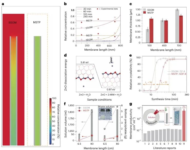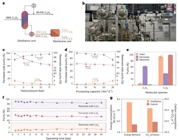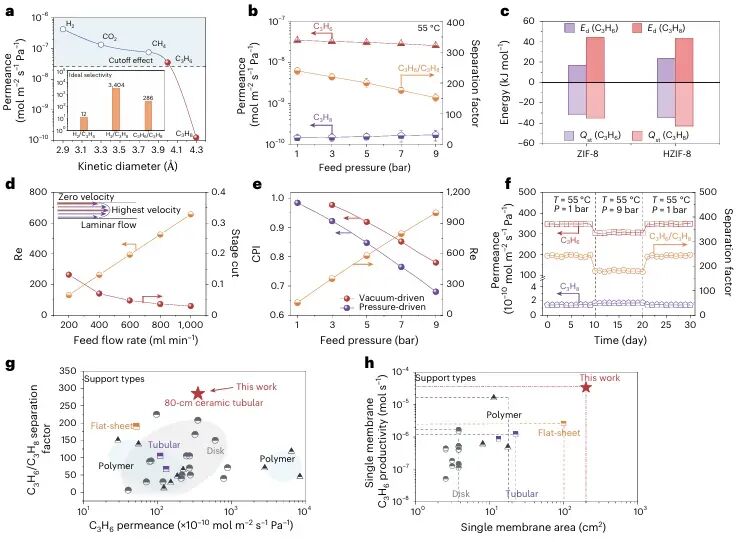 为制备大面积膜,研究人员首先在80厘米长的管式陶瓷支撑体内表面均匀生长了ZnO纳米棒阵列(直径~100 nm,长度~600 nm),作为锌源和生长骨架。支撑体顶层的算术平均粗糙度(Ra)为0.53 μm,最大高度粗糙度(Rz)为2.05 μm,最可几孔径约100 nm(图1a)。优化后得到单层垂直排列的ZnO纳米棒(图1b),其氮气通量与空白支撑体相似,且机械稳定性强。随后,注入1.5 M的2-MIM水溶液,在60°C下反应,ZnO纳米棒逐渐转化为连续的ZIF-8膜。扫描电子显微镜(SEM)显示,形成的膜厚约1 μm,无纳米棒残留,且沿80 cm长度(有效面积~200 cm²)形貌一致(图1c)。X射线衍射(XRD)和X射线光电子能谱(XPS)证实了Zn-N和Zn-O配位环境共存,形成了由约82% ZIF-8和约18%残留ZnO纳米棒组成的异质结构HZIF-8膜(图1d, e, f, g)。高分辨透射电镜(HRTEM)显示ZnO(101)晶面(晶格间距0.24 nm)优先溶解。残留的ZnO增强了膜的热稳定性和水热稳定性(图1h, i),且HZIF-8的吸附等温线变得平滑(图1j),表明骨架刚性化,抑制了“开门”行为。 MSTP的可扩展性源于其对浓度梯度的精确控制。计算流体动力学(CFD)模拟显示,传统种子-二次生长法(SSGM)在膜长从6.5 cm增至80 cm时,沿轴向产生陡峭的浓度梯度(图2a, b)。而MSTP即使在反应240分钟后,轴向和径向浓度分布依然均匀(图2b),这得益于其短且均匀的径向扩散路径(约4 mm)和固定的Zn²⁺源。密度泛函理论(DFT)计算表明,2-MIM配体在ZnO(101)晶面的吸附能为-0.92 eV,且配体辅助的Zn²⁺释放能(0.97 eV)远低于水中裸ZnO(5.81 eV),表明表面直接转化热力学有利(图2d)。动力学上,MSTP具有更长的诱导期(t₀ = 16分钟,比SSGM长77%)和更长的结晶期(t₁ = 51分钟,是SSGM的1.55倍),有利于均匀成核和晶体缓慢生长(图2e)。此外,MSTP所需合成液总体积仅为SSGM的约2%,产率高达约5 cm² ml⁻¹,比已有方法高约50倍(图2f, g),显著减少了副产物和废液。HZIF-8膜对C₃H₆的渗透率为3.2×10⁻⁸ mol m⁻² s⁻¹ Pa⁻¹,理想选择性高达286(图3a)。在9 bar和55°C条件下,C₃H₆渗透率为2.6×10⁻⁸ mol m⁻² s⁻¹ Pa⁻¹,分离因子为152(图3b)。涂覆聚二甲基硅氧烷(PDMS)的PDMS/HZIF-8膜在高压下性能更优。气体吸附和扩散能垒分析表明,C₃H₆在HZIF-8中的吸附热(Qₛₜ)高于纯ZIF-8(图3c),归因于ZnO引入的极性界面增强了与丙烯π电子的相互作用。长膜管(80 cm)允许更高进料流速,减轻了浓差极化(图3d, e)。该膜在55°C、1 bar和9 bar下连续运行近30天,性能稳定(图3f),其综合性能优于多数报道的ZIF-8膜(图3g, h)。MSTP策略支持连续化的“管对管”制造工艺。研究团队将234根陶瓷管安装在传送带系统上,依次经锌溶液、2-MIM水溶液和甲醇处理,批量制备了HZIF-8膜(图4a, b)。随机抽样的膜微观结构均匀。234张膜的平均C₃H₆渗透率为3.58×10⁻⁸ mol m⁻² s⁻¹ Pa⁻¹,平均分离因子为277,合格率超过90%(图4c, d)。成本分析显示,此方法制备的HZIF-8膜总成本约为266美元/平方米,比传统方法低一个数量级(图4e)。研究团队开发了一个撬装式模块化膜分离单元(占地2.0 m × 1.2 m × 1.5 m,膜面积1.6 m²,处理能力5–30 Nm³ d⁻¹),用于在丙烯精馏塔底进行侧流分离(图5a, b)。在17 bar、5 Nm³ d⁻¹进料条件下,该单元可将约95% C₃H₆/5% C₃H₈的进料提纯至渗透侧64% C₃H₆和截留侧99.5% C₃H₆(图5c, e)。系统在30天连续运行中表现稳定(图5f)。Aspen Plus流程模拟表明,集成该膜单元后,裂解炉能耗预计降低约3%,CO₂排放减少约630吨/年(图5g)。图 5 | PDMS/HZIF-8 膜工业侧流分离 MSTP策略通过稳定定向生长和抑制均相成核,克服了ZIF-8膜的可扩展性瓶颈,实现了大面积、无裂纹膜的直接制备,且废液极少。机理研究和批次一致性表明,残留的ZnO纳米棒在引导生长和增强膜的高压、操作稳定性方面发挥了双重作用。该工艺可重现、成本效益高,且与连续化制造兼容,展现了强大的工业应用潜力。MSTP为分离用MOF膜的规模化提供了一个多功能平台。未来的工作应将此方法扩展到其他MOF体系,并在真实的工业条件下探索膜模块的长期性能。