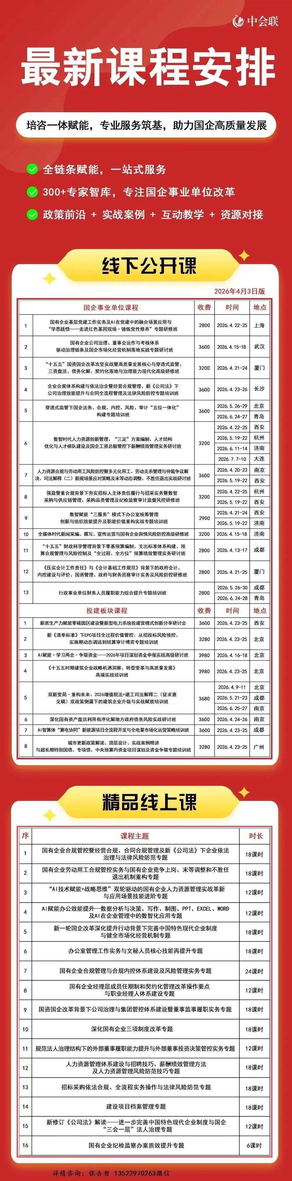 (“国企改革交流群”入群方式单位+姓名+微信13522970263)当前,国企改革深化提升进入攻坚期,人力资源管理面临政策密集调整与合规刚性约束双重挑战。国务院国资委依据改革战略部署,明确提出一系列强化国有企业用工管理政策导向。其中,强调国有企业需推进用工模式多元化,通过全面用工盘点优化人员结构,实现人岗精准匹配;强化管理机制市场化,明确全面推行管理人员“竞争上岗、末等调整、不胜任退出”制度,打破传统人事管理壁垒,引入市场竞争淘汰机制,激发员工能动性与潜能;推动合规体系标准化,以《劳动合同法》及司法解释为依据,构建全流程风险防控机制。同时,《最高人民法院关于审理劳动争议案件适用法律问题的解释(二)》的正式施行,对外包用工主体认定、未签劳动合同二倍工资豁免、社保合规、竞业限制效力等七大用工争议焦点作出全新规定,对企业用工合规提出更高要求。为深化国有企业改革,建立健全市场化经营机制,规范和引导国有企业推行末等调整和不胜任退出制度合规落地实施,充分调动干部职工的积极性、主动性、创造性,构建合规的人力资源管理体系,解决企业在市场化和多元化用工过程中存在的问题,以及司法解释(二)、《工伤保险条例》若干问题的意见(三)等新规应对策略,增强企业活力与人力资源效能,中国人力资源开发研究会培训中心联合北京中会联管理咨询中心定于2026年4月、5月份分别在南京市和西安市举办“人力资源合规与劳动用工风险防控暨多元化用工、劳动关系管理与仲裁争议解决、司法解释(二)新规场景应对策略及末等动态调整、不胜任退出”实战研讨班。请各单位积极组织相关人员参加研讨和学习。【培训内容】
