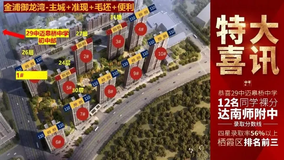 • 准现住房 交付无忧目前,项目的一期二期已经建成交付,三期规划12万方,共计10栋建面约89-122㎡的轻奢美学高层住宅,同时为响应保交楼举措,项目所有资金也得到了政府的监管保障,将如期交付给买房人,真可谓准现房所见即所得。• 名校环伺 全龄无忧项目周边众多优质教育资源环伺,学前教育、小学、初中全龄段覆盖;项目内部规划有两所幼儿园小学: 迈皋桥中心小学,板块最好的小学初中:29中分校,以开第四年,无需为孩子的教育问题担忧、此外北面约4公里范围内还有南京外国语学校仙林分校、泰晤士国际学校两所优质的民办教育,让孩子享受忧渥的教育资源,成就菁英之路。