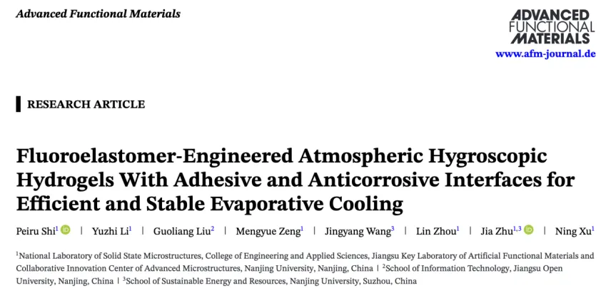 南京大学固体微结构物理国家重点实验室、工程与应用科学学院、江苏省人工功能材料重点实验室、先进微结构协同创新中心课题组。该课题组通过设计一种基于氟橡胶的界面工程策略,成功构建了具有粘附和抗腐蚀双重功能的Janus结构水凝胶,在保持高吸湿能力的同时,解决了传统吸湿水凝胶界面热阻高和卤化物盐泄漏腐蚀设备的关键难题。