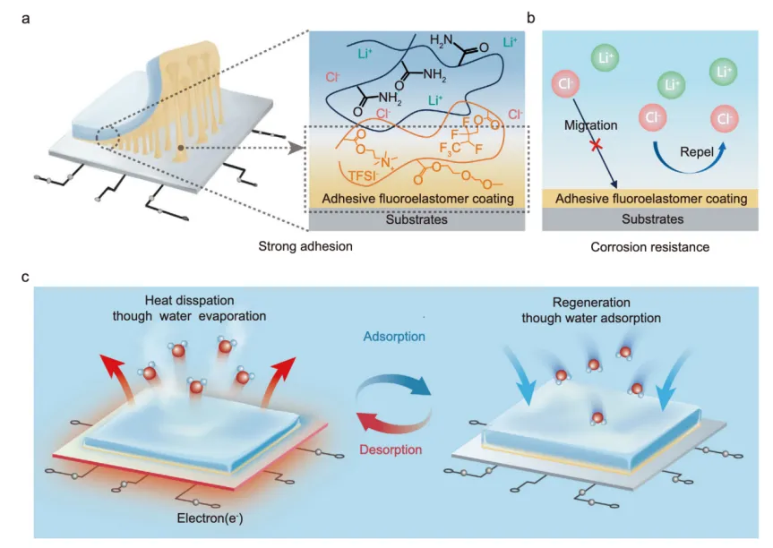 电子冷却用粘合型氟橡胶工程化大气吸湿水凝胶( FAHH )示意图。( a ) FAHH与左边的子状态之间的强粘附性示意图。FAHH的化学成分在右侧。( b )氟橡胶界面的疏水性和电负性阻止氯离子和防止水和盐的泄漏,使FAHH具有耐腐蚀性。( c )电子器件冷却用FAHH的工作原理。在吸附循环过程中,FAHH从周围大气中捕获水分。 在较重的工作负荷下,随着装置温度的升高,开始进行解吸循环,在此过程中,水在热能的驱动下从水合FAHH中蒸发,从而散发热量