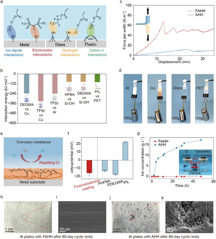 FAHH的稳定冷却界面。( a ) FAHH与不同基底(金属、玻璃和塑料)的粘附机理示意图。( b )通过DFT计算氟橡胶界面官能团与各种基底之间的结合能。( c )通过180 °剥离测试FAHH和AHH对铝板的粘附强度,表明氟弹性体界面的掺入显著增强了PAM水凝胶的粘附性。( d ) FAHH粘附在不同基底(铝、铜、玻璃和聚对苯二甲酸乙二醇酯)上的照片,重量为100 g。( e ) FAHH的耐腐蚀机理。氯离子被电负性氟橡胶界面排斥。 ( f )氟橡胶界面和构成氟橡胶界面的三种均聚物:PHFBA、PDEGMA和P [ MATAC ] [ TFSI ]的Zeta电位测试,表明氟橡胶界面的电负性归因于PHFBA和PDEGMA。插图为测试装置。( h-k )数码照片和SEM图像显示,在60天的循环试验(每循环吸附16 h ,解吸8 h)后,铝板与FAHH和AHH接触