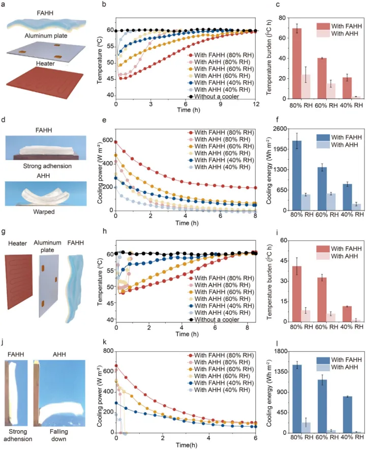 3.高效冷却性能:在水平放置、工作温度60°C、80%RH吸附条件下,FAHH在前5小时内实现了平均11.3°C的温降和343.8Wm⁻²的平均冷却功率,显著优于传统AHH(温降6.5°C,功率109.3Wm⁻²)。其12小时内的冷却能量在80%RH下达到2213Whm⁻²。在垂直条件下,FAHH仍能维持有效冷却(80%RH下平均温降5.1°C),而AHH则因脱落迅速失效。这归因于强粘附确保了低界面热阻。