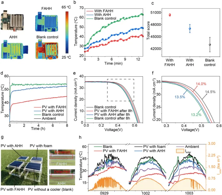 实际应用的演示。( a ) FAHH、AHH和空白(没有冷却器)在高负荷运行后所附单板计算机设备的照片和红外图像。( b )单板计算机设备在高负荷试验时的温度曲线。( c )高负荷测试代表工作绩效的总分比较。( d )在1个太阳光照下,FAHH和AHH所附太阳能电池的温度曲线。( e ) FAHH、AHH和空白附着的太阳能电池在1个太阳光照下测试8 h前后的光伏性能。( f ) e )的局部放大图。( g )室外试验照片。 四个样品:没有冷却器的太阳能电池(空白),安装有10厘米厚泡沫的太阳能电池,覆盖有FAHH和AHH的太阳能电池。( h )在2024年9月29日、10月02日和10月03日测量了3天的温度曲线和太阳辐照度( Isolar )。所有数据均以1 min为间隔进行记录