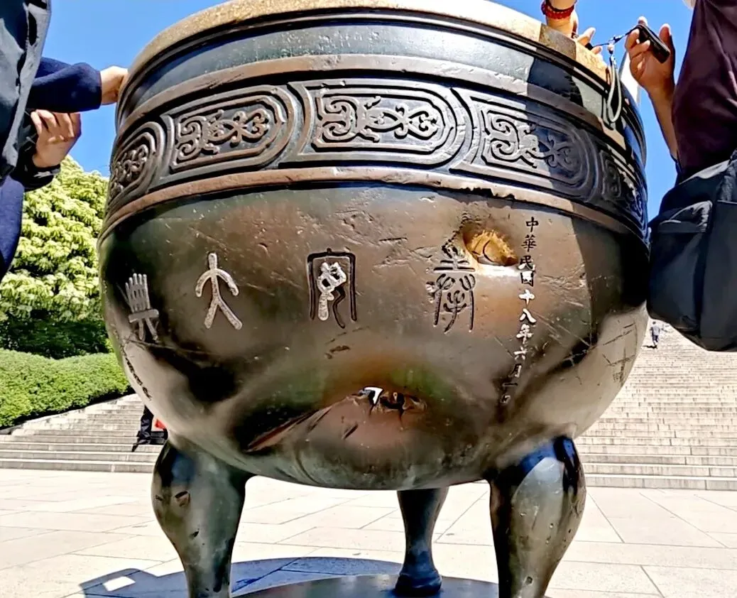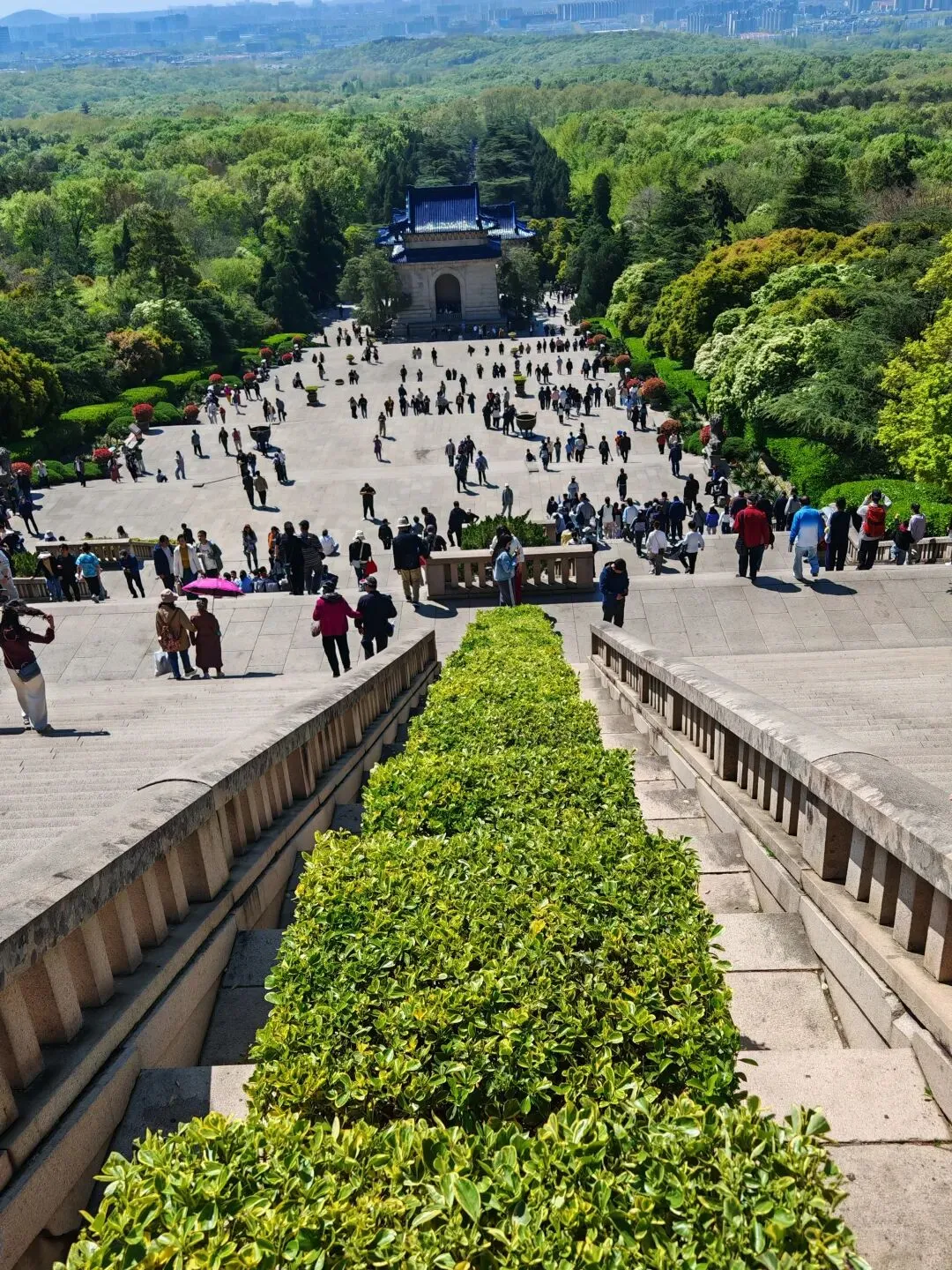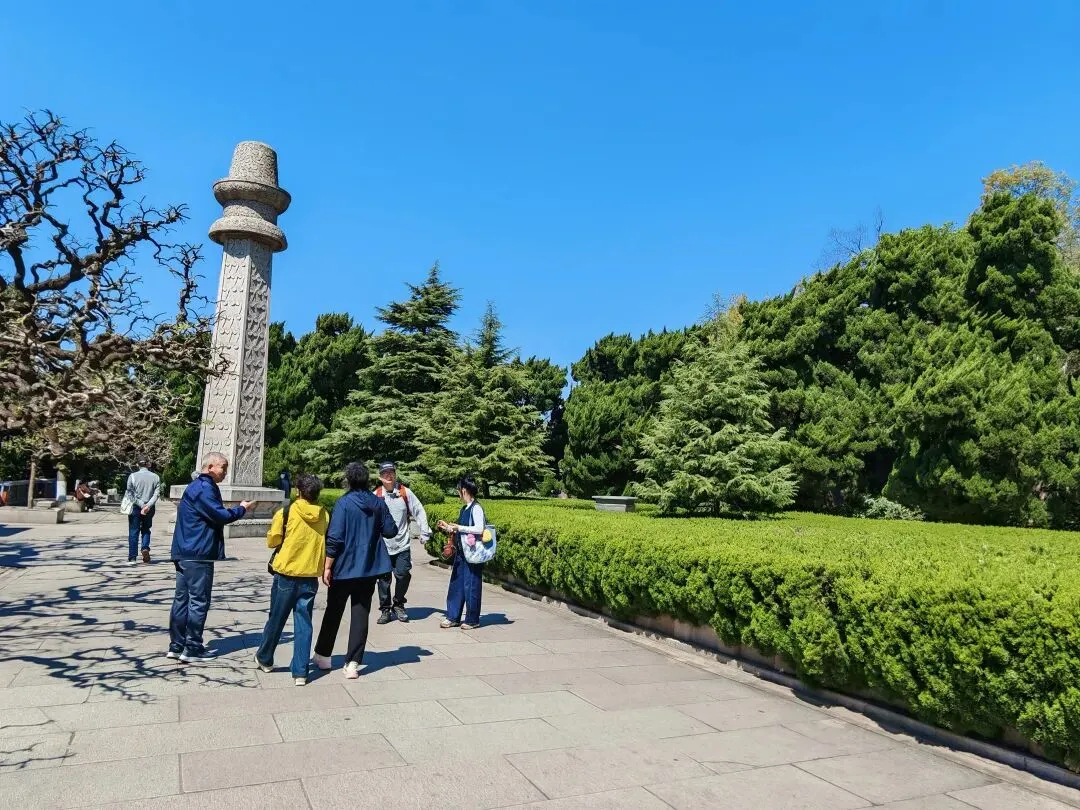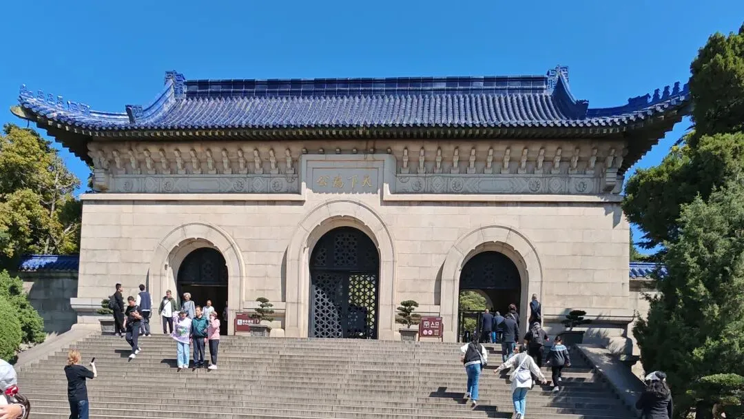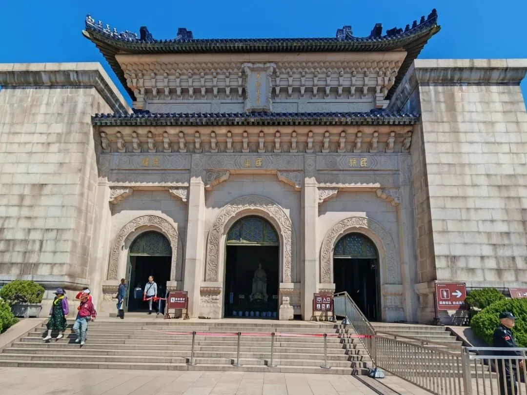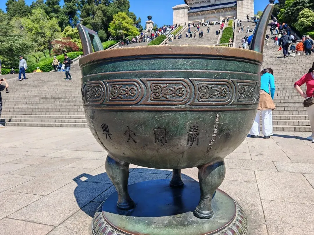 昨天预约了中山陵,上午自然拜谒中山陵。首先是“博爱”牌坊,然后是陵门,接着是碑楼,最后登上392级台阶,就来到了祭堂。祭堂中间是中山先生汉白玉坐像,后面的陵寝大门紧闭,是不开放的。在通往祭堂的半山,有一对奉安纪念仿古铜鼎,是1929年民国上海特别市政府为纪念孙中山先生安葬中山陵而敬献的。鼎壁上铸有“奉安大典”篆字,西侧铜鼎腹壁上有1937年12月侵华日军炮弹击中的两个弹孔。