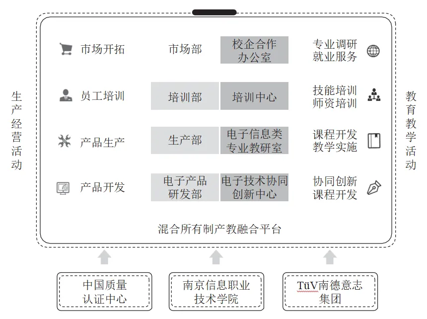 2012 年,南京信息职业技术学院与中国质量认证中心基于价值创造与共享理念,通过股权形式共建混合所有制产教融合平台—中认南信检测技术有限公司,TüV 南德意志集团随后加入,实现校企双方的利益捆绑;确立了电子信息类专业人才培养围绕产教融合平台的基本思路,制定了平台与专业一体化管理的制度,如图 1 所示。公司的智能电子产品研发部、生产部、培训部和市场部同时也是分院的电子技术协同创新中心、电子信息类专业教研室、培训中心和校企合作办公室,4 个部门共同承担公司的生产经营活动和学院的教育教学活动。自 2012 年以来,累计投入资金 6000 万元,使教学仪器设备与产业发展同步迭代更新,确保学校的教学环境与产业的工作环境紧密对接。