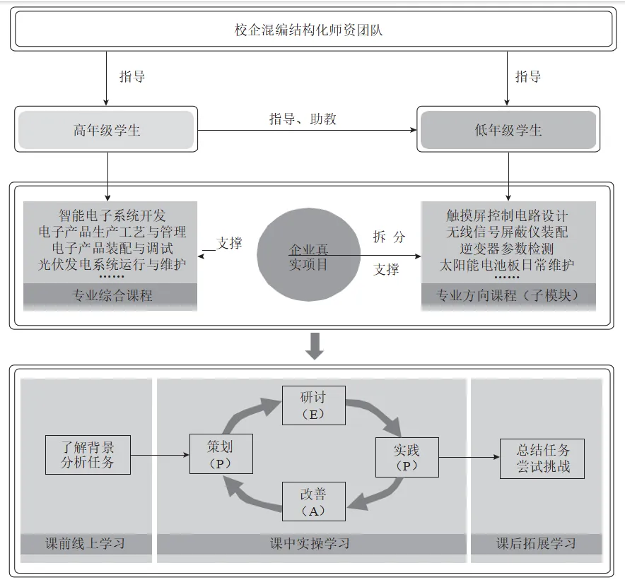 深化“学习促进工作,工作实现学习”教学模式改革,聚焦电子信息行业岗位群所需的核心知识技能,创设“生产工作坊”8 个,分别承担 8 门综合性课程和 12 门专业方向课程的部分模块。打破传统课程边界,课程教学内容根据企业生产任务按年度动态调整,按照企业生产流程由校企双方人员按照各自的技术特长合作完成不同的模块教学,同时高年级学生也会承担低年级学生的简单任务指导;综合考量学生的学习态度、素质养成、知识技能掌握情况及真实工作成效等因素,开展形成性评价。通过全面实施“PEPA”(策划 Plan、研讨 Explore、实践 Practice、改善Ameliorate)教学四步法,实现“学校 + 企业”双境育人、“教师 + 师傅”双师授课、“学生 + 员工”双角色成长、“线上 + 线下”双渠道学习,系统提升学生的实战能力,如图 2 所示。
