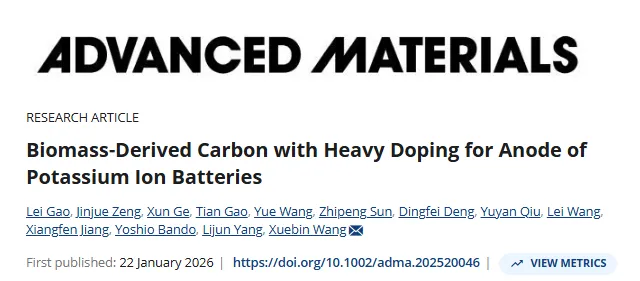 L. Gao, J. Zeng, X. Ge, T. Gao, Y. Wang, Z. Sun, D. Deng, Y. Qiu, L. Wang, X. Jiang, Y. Bando, L. Yang, X. Wang*, "Biomass-Derived Carbon with Heavy Doping for Anode of Potassium Ion Batteries," Adv. Mater.,