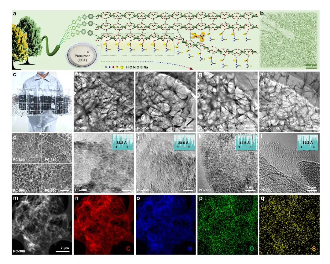 提出了重掺杂型生物质衍生多孔碳的制备路径:通过将纤维素与氢氧化钠和硫脲络合,形成富含异质原子的前驱体,再经热解过程实现异质原子在碳基质中的高浓度掺杂。这有效增大了石墨层间距,增加了活性位点和介孔结构,为钾离子的高效存储提供了有利条件。