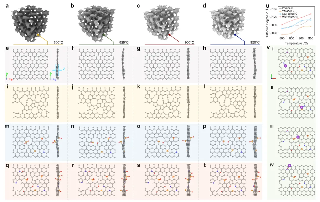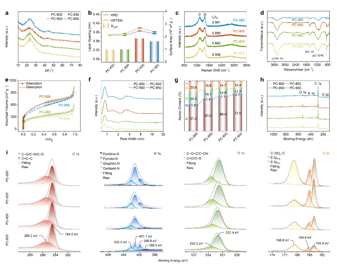 研究还探讨了热解温度对碳材料结构转变的复杂影响。随着热解温度的升高,碳基质中的异质原子逐渐损失,生成多级孔隙结构,比表面积显著增加。然而,过高的热解温度会导致缺陷被消去,并引发石墨化程度增加和比表面积减少的过程。