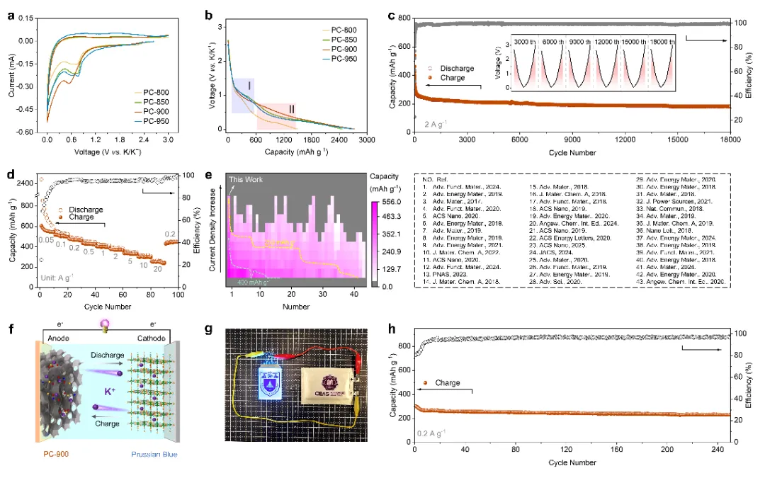 实验结果显示,重掺杂多孔碳材料PC-900用作钾离子电池负极时表现出色,循环寿命长达18,000次,且在20 A g⁻¹的高电流密度下,仍能保持260 mAh g⁻¹的比容量。