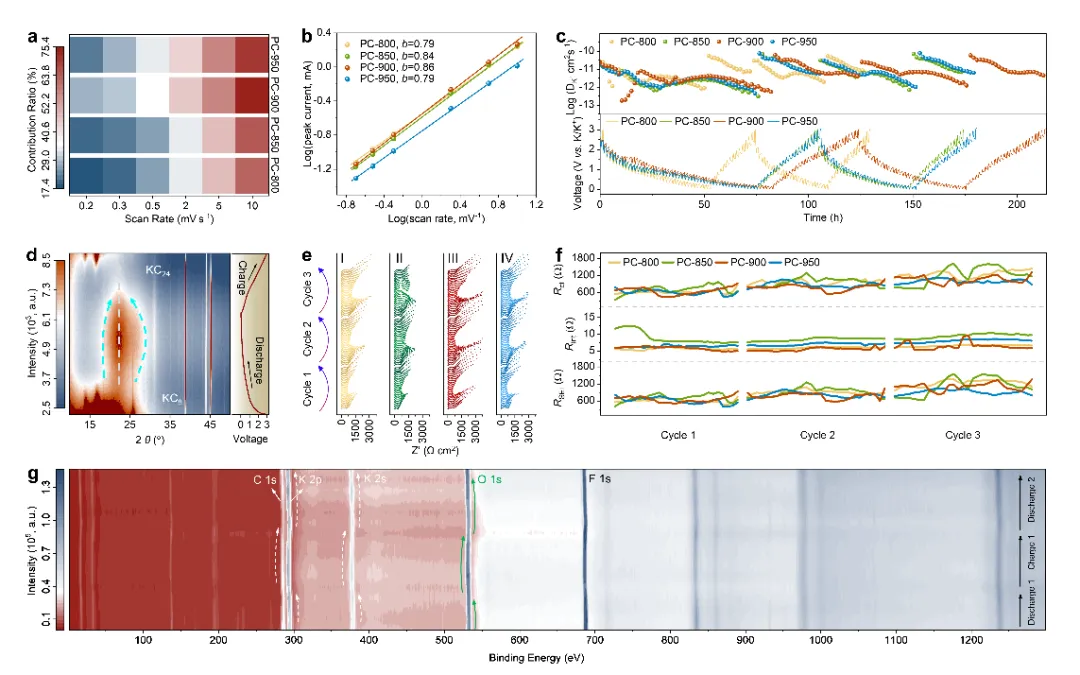 研究团队探讨了热解过程中异质原子掺杂对碳材料结构的影响,发现通过精确控制热解温度,可以有效调控掺杂浓度,进而优化碳材料的石墨层间距、比表面积和活性位点数量。这些结构特性共同作用于钾离子的存储和释放过程,提升了碳负极材料的循环稳定性和倍率性能。