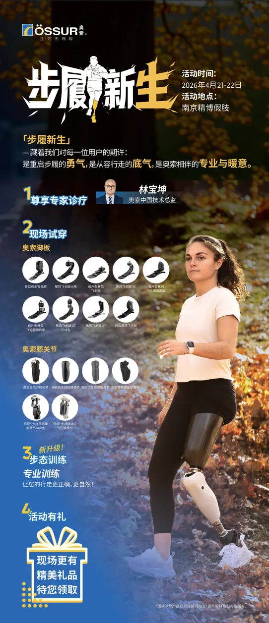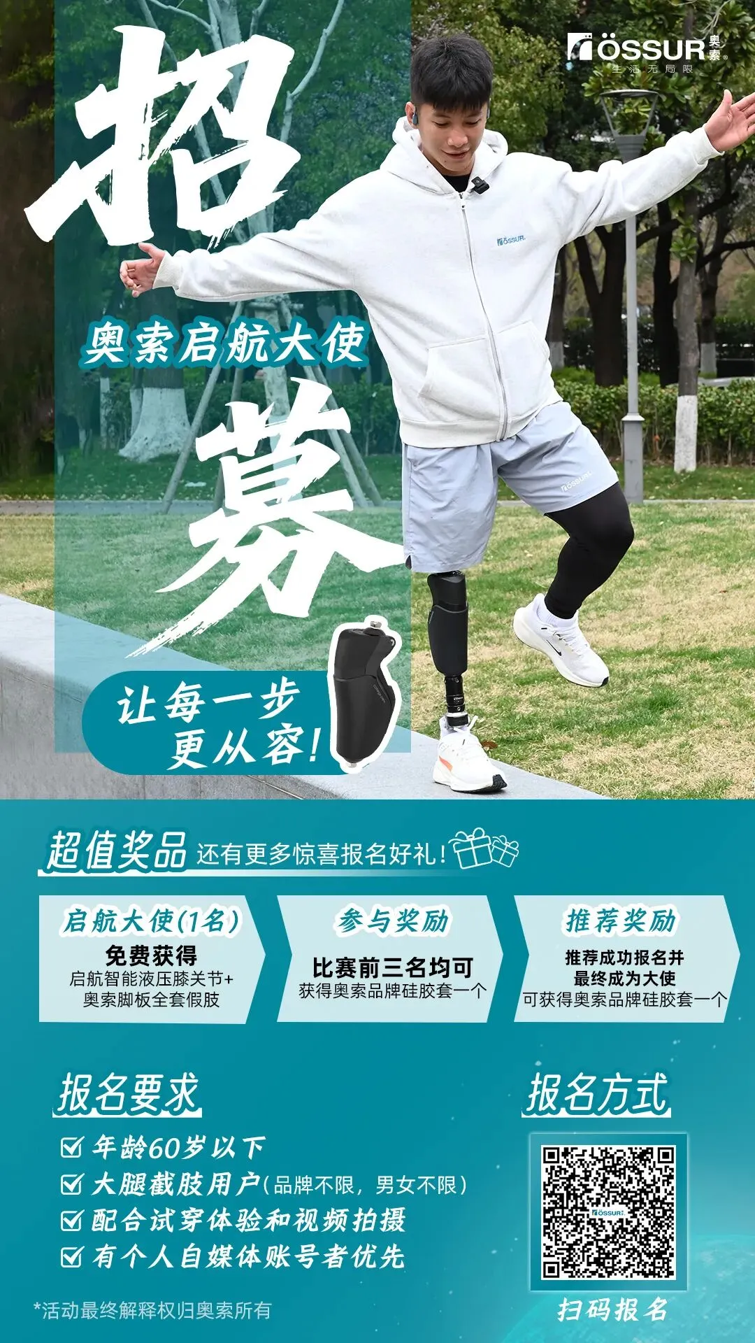 四月起,奥索将联合全国经销商开启启航大使招募活动。大腿截肢者可以在“步履新生”活动中试穿全新启航智能液压膝关节并获得免费步态指导。参赛选手均有精美礼品一份,总冠军还将获得免费的奥索启航假肢一套。