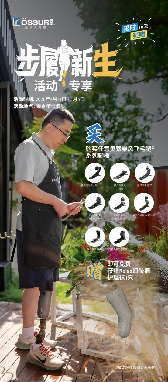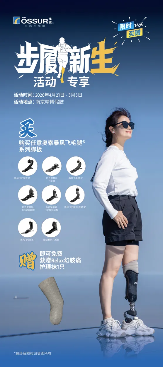 买赠期间,凡在该活动处购买奥索暴风飞毛腿系列脚板的用户,均可免费获赠Relax幻肢痛护理袜一只,为您的康复之路添一份贴心守护!