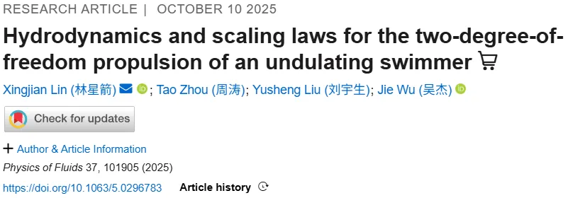 在自然界中,鱼类凭借其卓越的游动能力成为了仿生学的热点研究对象之一。然而,鱼类高效游动的内在机理至今依然有许多存疑之处。近日,南京工程学院林星箭副教授作为第一作者兼通讯作者,在国际权威期刊《Physics of Fluids》发表最新研究成果(标题:Hydrodynamics and scaling laws for the two-degree-of-freedom propulsion of an undulating swimmer),揭示了波动游动中频率与波长对推进性能的耦合影响,提出了新的推进效能标度律,为仿生机器鱼的优化设计提供了理论参考。论文研究得到了南京航空航天大学吴杰教授的宝贵建议和热心支持。