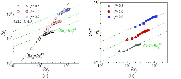 论文将鱼类游动简化为两自由度自推进的波动水翼模型,通过数值模拟方法,系统研究了不同频率和波长组合下仿生鱼的自主游动性能。研究发现,游动速度随频率增加而单调提升,但随波长的变化呈非单调趋势,最佳波长约为1.25倍体长,且该最优值与频率无关。同时,论文研究发现,仿生鱼推进效能的标度率依赖于波长。当波长不超过1.5倍体长时,推进速度满足Reu∼Ref4/3;当波长超过1.5倍体长时,推进速度满足Reu∼Ref1/2。并且,仿生鱼的推进效率满足CoT∼Ref2/5。此外,论文分析了仿生鱼游动的推力来源,发现推力主要来源于躯体尾部30%的部位(贡献了超过70%的净推力),同时其余的躯体部位也会“按需发力”,例如:鱼体头部在波长较大的情况下会利用前缘涡的吸附效应产生推力,鱼体中部则会在波长较短时辅助产生推力。本文研究成果有助于人们深入理解鱼类的高效游动机制,并为仿生机器鱼的效能优化设计提供理论参考。