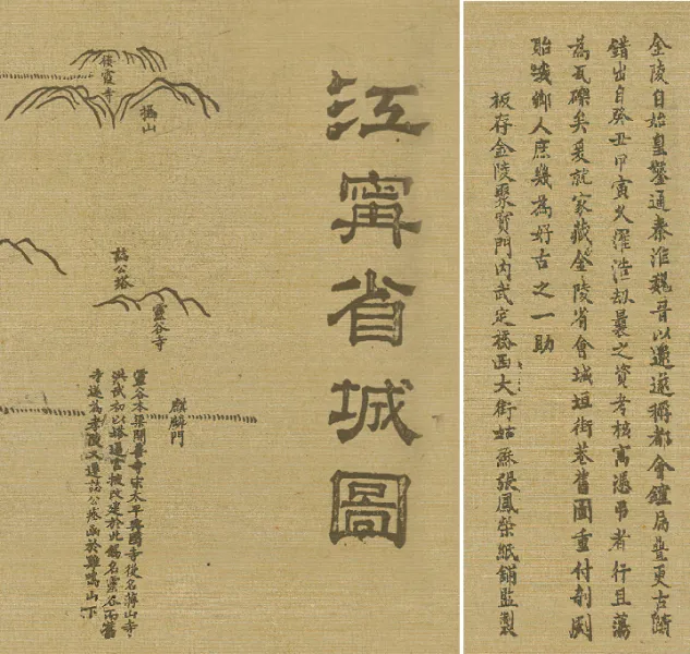 刻板存放于金陵聚宝门内武定桥西大街,由姑苏张凤荣纸铺监制。南京城内城墙、官署、军营、街坊巷弄、河流、山川、桥梁、寺观庙宇及部分景点以文字注记。秦淮河畔的乌衣巷、夫子庙,与明孝陵、中山陵等古迹并存,太平天国时已废弃的江宁府学、毁于战火的大报恩寺和八旗驻防城俱在原址,形成时空交织的文化层积。