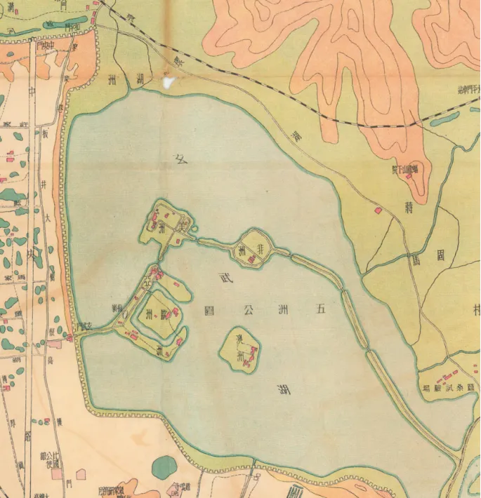 传统中国行政都市的空间特色在地图上一览无余,新涌现的近代城市空间要素也能在地图上一一展现,充满了时代气息,展示了一幅新旧更替、中西交融的近代中国城市图景。图中用大号字体标注后湖,同时标注为元武湖、昆明池,湖中标有新洲、旧洲、莲萼洲、龙引洲四洲。该地图上还标注了前湖(钟山前面又名燕雀湖)、中湖(太平门外)。