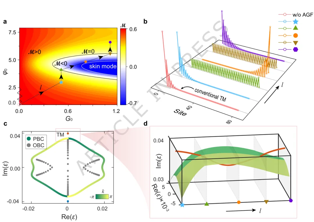 所选择的规范场,精确调控拓扑模式的耗散,并跨越体模式的耗散范围,从而促进从局域态到完全离域态的转变。这些本征模式,可通过神经网络进行精确设计,实现具有定制化轮廓的拓扑态,这些拓扑态在频谱上与体带保持隔离,并表现出了相较于其他模式更低的损耗。