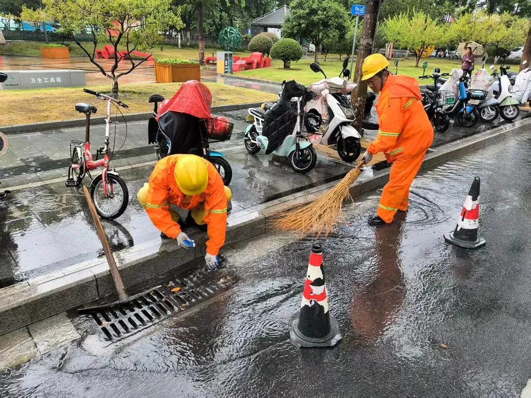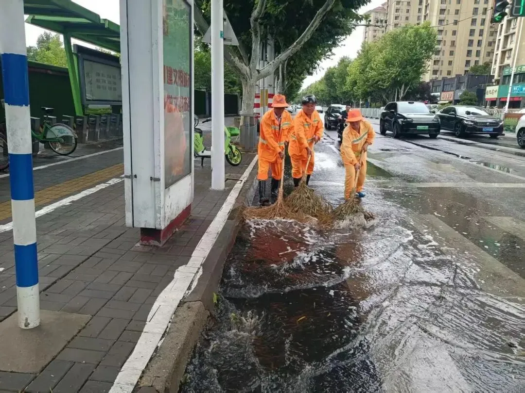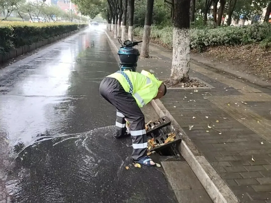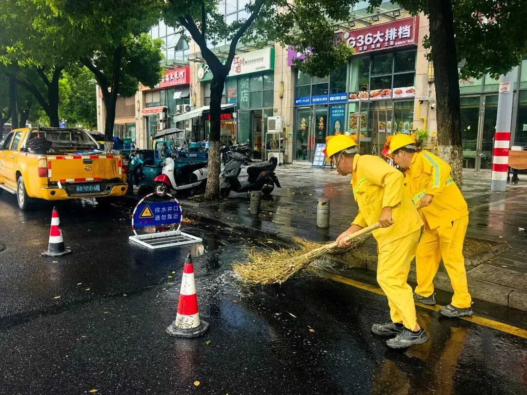 六合区城管执法队员深入沿街商铺,督促加固或更新隐患广告牌,严防高空坠物、倾倒等。针对主城区长江路、泰山路、延安路、园林路等重点路段,保洁人员加大巡查力度,采取推水作业与清掏杂物同步进行的方式,及时清除落叶、垃圾及淤泥,避免排水口堵塞,最大限度提升排水效率。