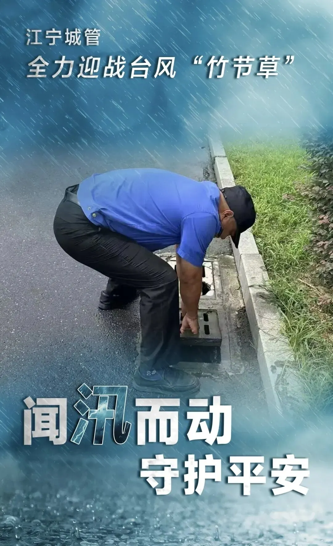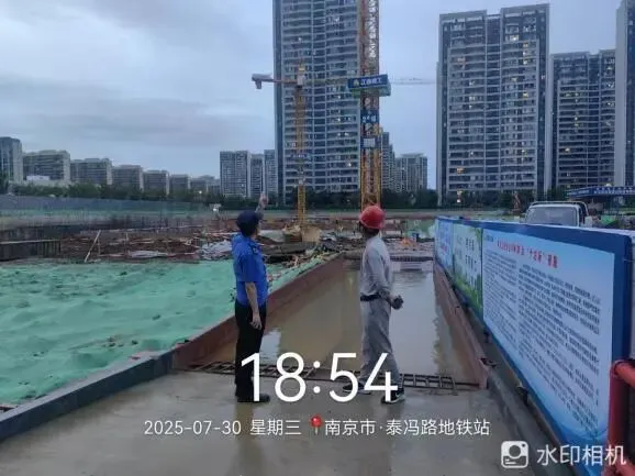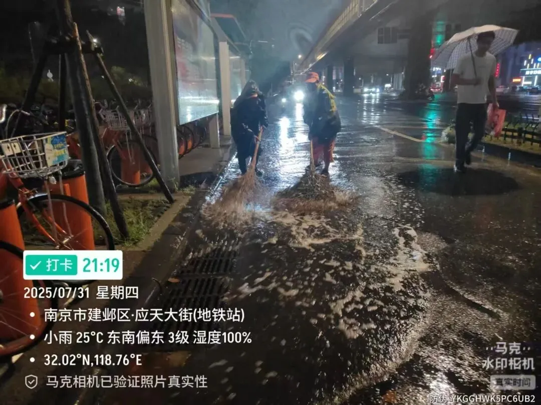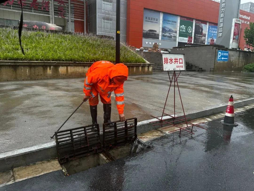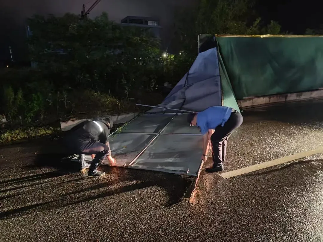 江北新区城管部门在岗在位,强化24小时应急值守,全力开展在建工地巡查,重点排查加固工地围挡;认真排查沿街商户户外广告牌、店招标牌、雨棚等,及时处置隐患;严盯易积淹水点,冒雨疏通、快速紧急排涝,力保道路畅通。